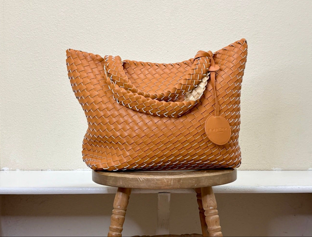 Isle Jacobsen Reversible Woven Tote Bag is made from supple, braided vegan leather. This classic tote is reversible, with a classic, open design this horizontal tote has braided handles with a logo tag tied around one side that hides a snap hook that can be used to clip on keys, Airpods, etc. Braided handles are long enough to be worn over the shoulder. No hardware.