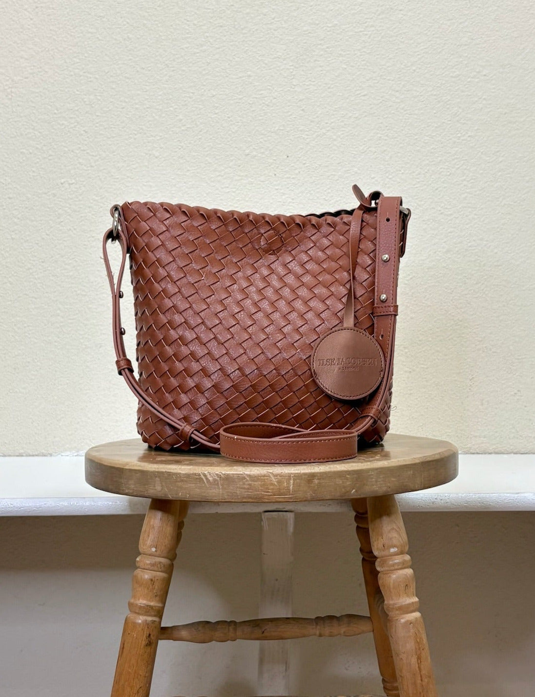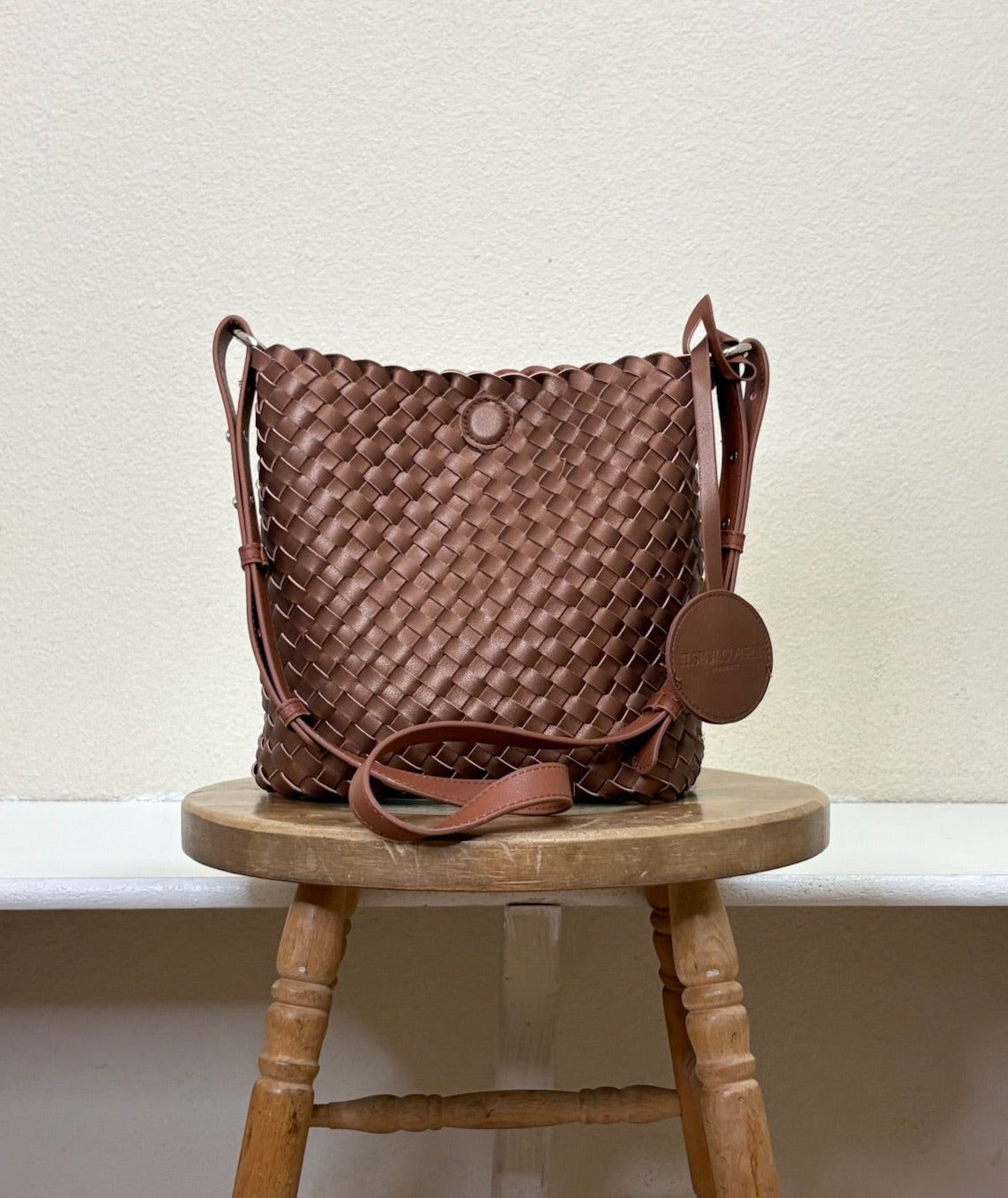 Isle Jacobsen Reversible Woven Tote Bag is made from supple, braided vegan leather. This classic tote is reversible, with a classic, open design. No hardware.