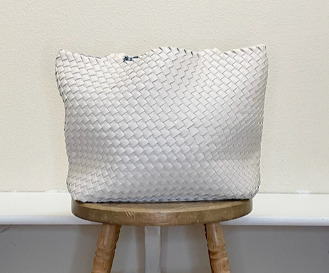 Isle Jacobsen Reversible Woven Tote Bag is made from supple, braided vegan leather. This classic tote is reversible, with a classic, open design this horizontal tote has braided handles with a logo tag tied around one side that hides a snap hook that can be used to clip on keys, Airpods, etc. Braided handles are long enough to be worn over the shoulder. No hardware.