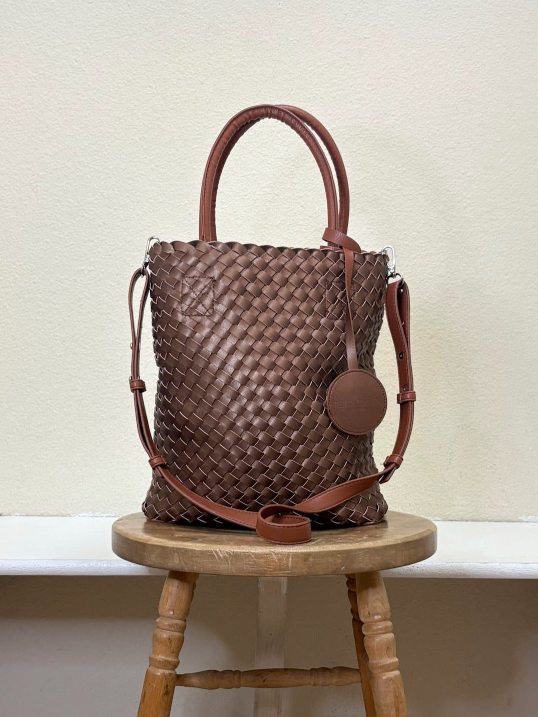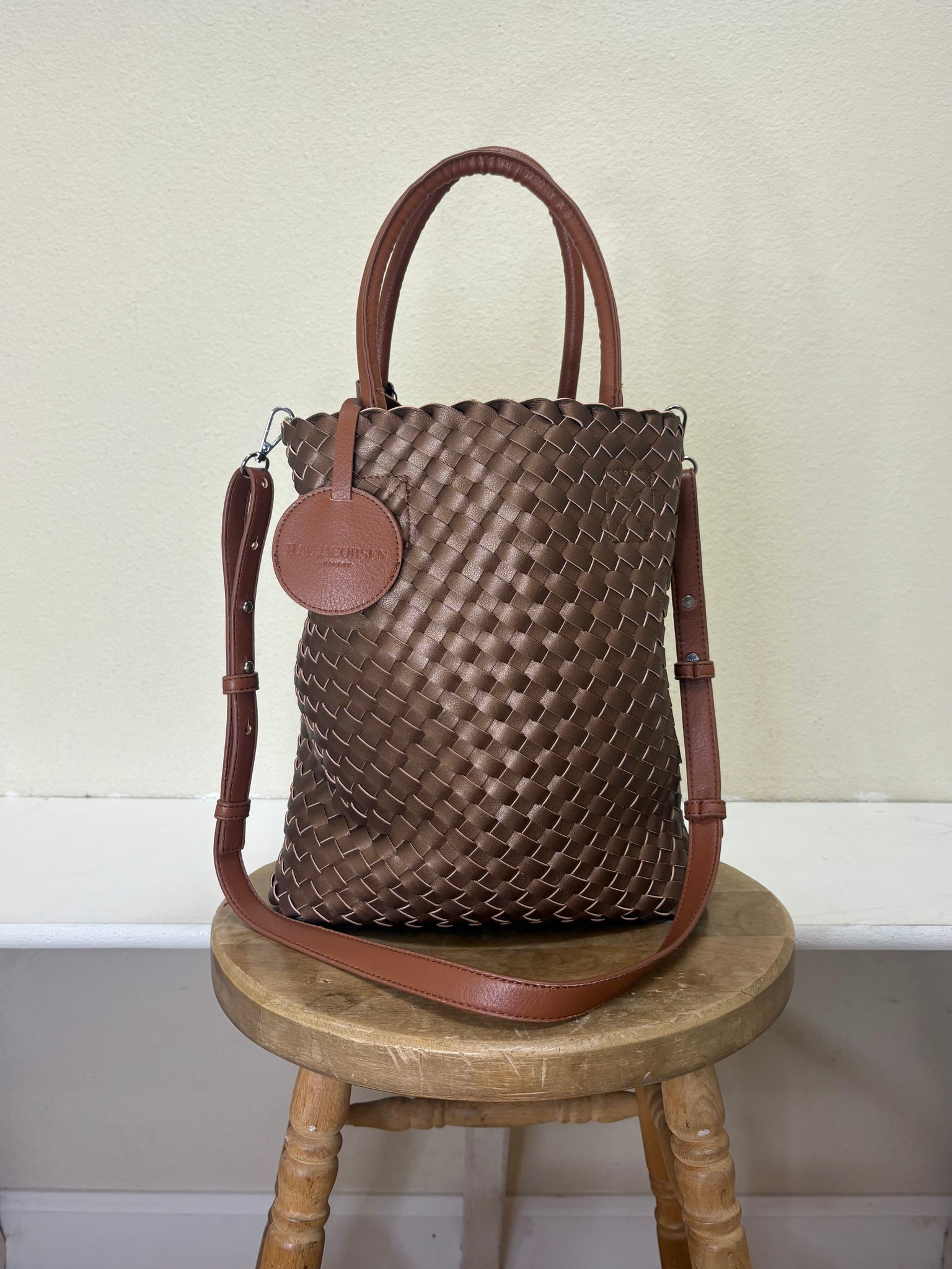 Isle Jacobsen Woven Vertical Tote Bag is made from supple, braided vegan leather. This vertical tote has handles to wear as a handbag, and includes a removable and adjustable cross-body strap for hands-free wear. Black on the outside and metallic dark grey on the inside. This bag has a tall, vertical and open shape. A hanging logo tag around a strap hides a snap hook that can be used to clip on keys, airpods, etc. Silver hardware.