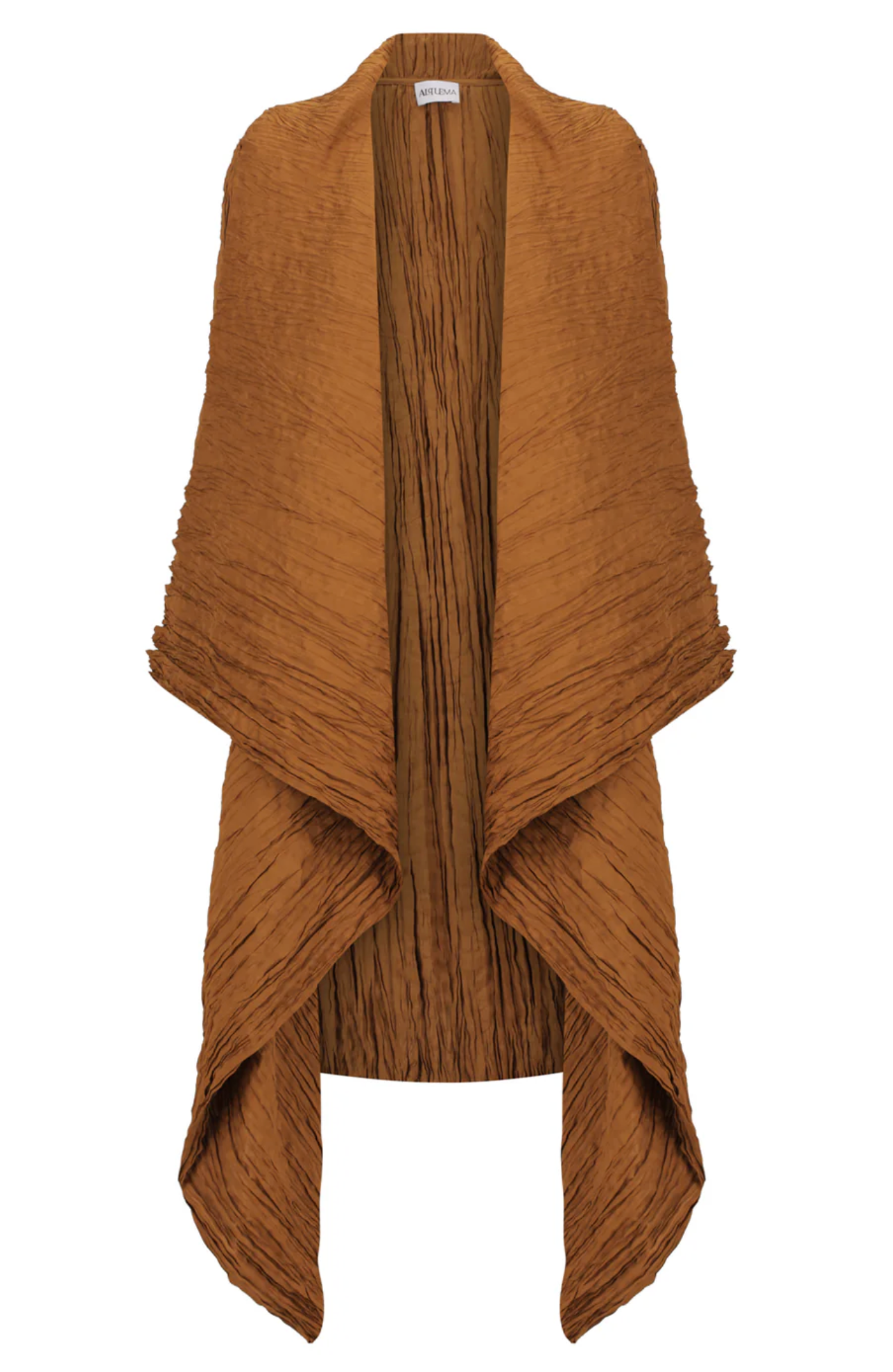 The Havana Coat is a graceful study in texture and tone. Crafted from 100% Soft Reverse Satin, this lightweight layer features a gentle ombré dye that shifts through a tonal palette. A large, flowing waterfall collar, which is an Alquema signature, frames the neckline, while long sleeves and a midi-length hem provide refined coverage. With its rich pleated texture and luxurious drape, the Havana Coat brings quiet drama to every ensemble.