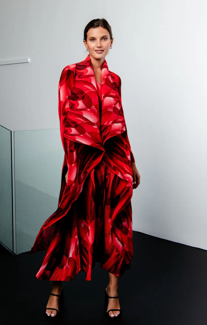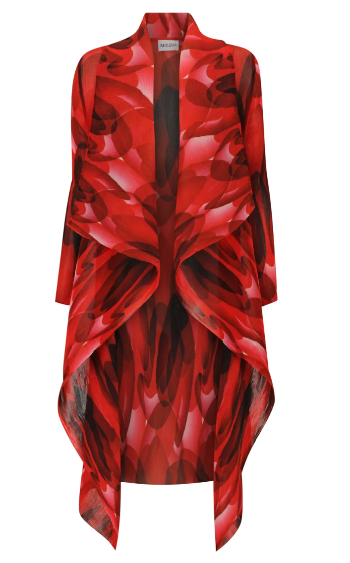 The Collare Coat is reminiscent of a waterfall. The beautiful pleated folds created within the chiffon material make it an easy to wear Alquema piece and is perfectly paired with the Long Estrella Dress.