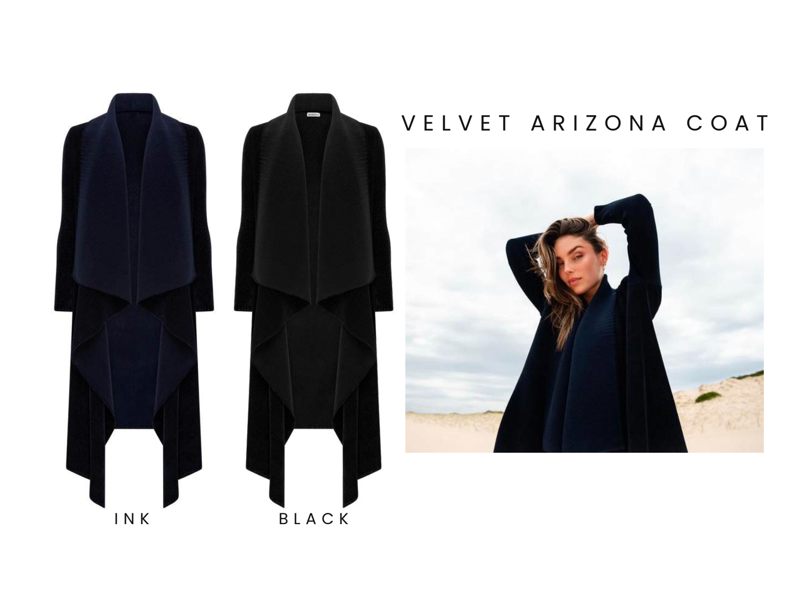 Our beloved Arizona Jacket is now offered with a bit of twist. The Velvet fabric adds the perfect sense of weight and holds true to the waterfall feel of the collar. The playful bounce of the pleat as you walk will make you want to dance.