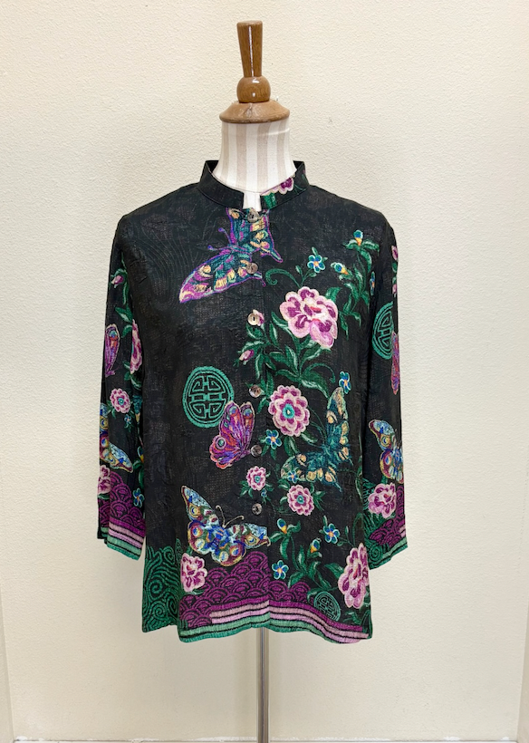 Classic Citron style blouse in our signature textured Silk Blend. Beautiful rich holiday colors with vintage fans elements on a dark colored background. Asymmetric floral/butterfly print with embroidery like elements with a touch of holiday colors. Slightly cropped, 3/4 sleeves. Machine Washable.
