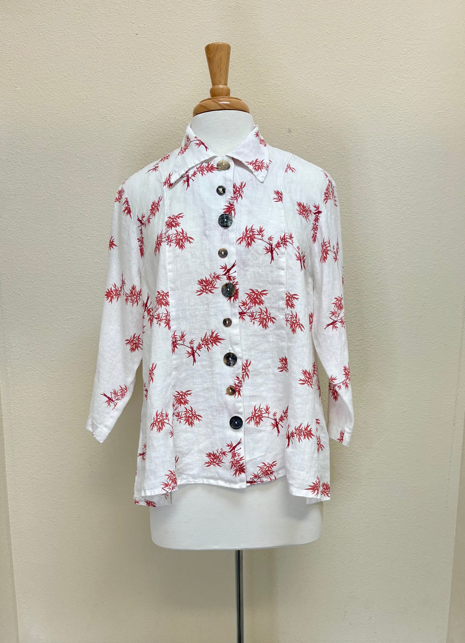 The Color Me Cotton CMC Top offers a refined addition to your collection. Crafted in white, it showcases a timeless silhouette accented by an Asian inspired bamboo print that's perfect for pairing with different trousers or skirts! Distinctive multi-sized seashell buttons enhance the shirt’s design, adding a subtle yet sophisticated detail that sets it apart.