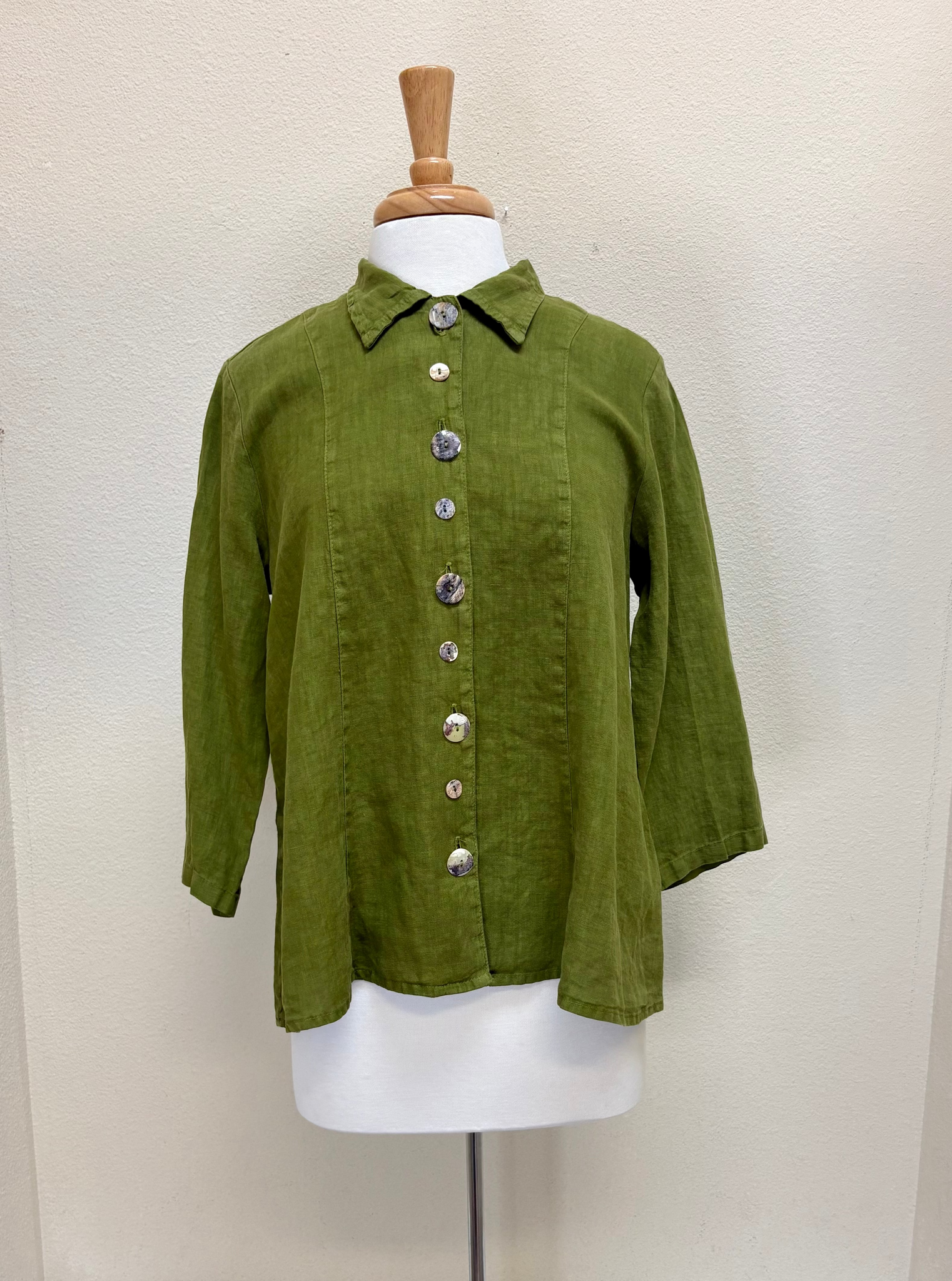 The Color Me Cotton CMC Top is a valuable addition to any wardrobe, combining a clean, classic silhouette with a serene Sage hue that complements numerous pants and skirts. This shirt is further distinguished by its distinctive seashell buttons, which vary in size to add a subtle, sophisticated detail.