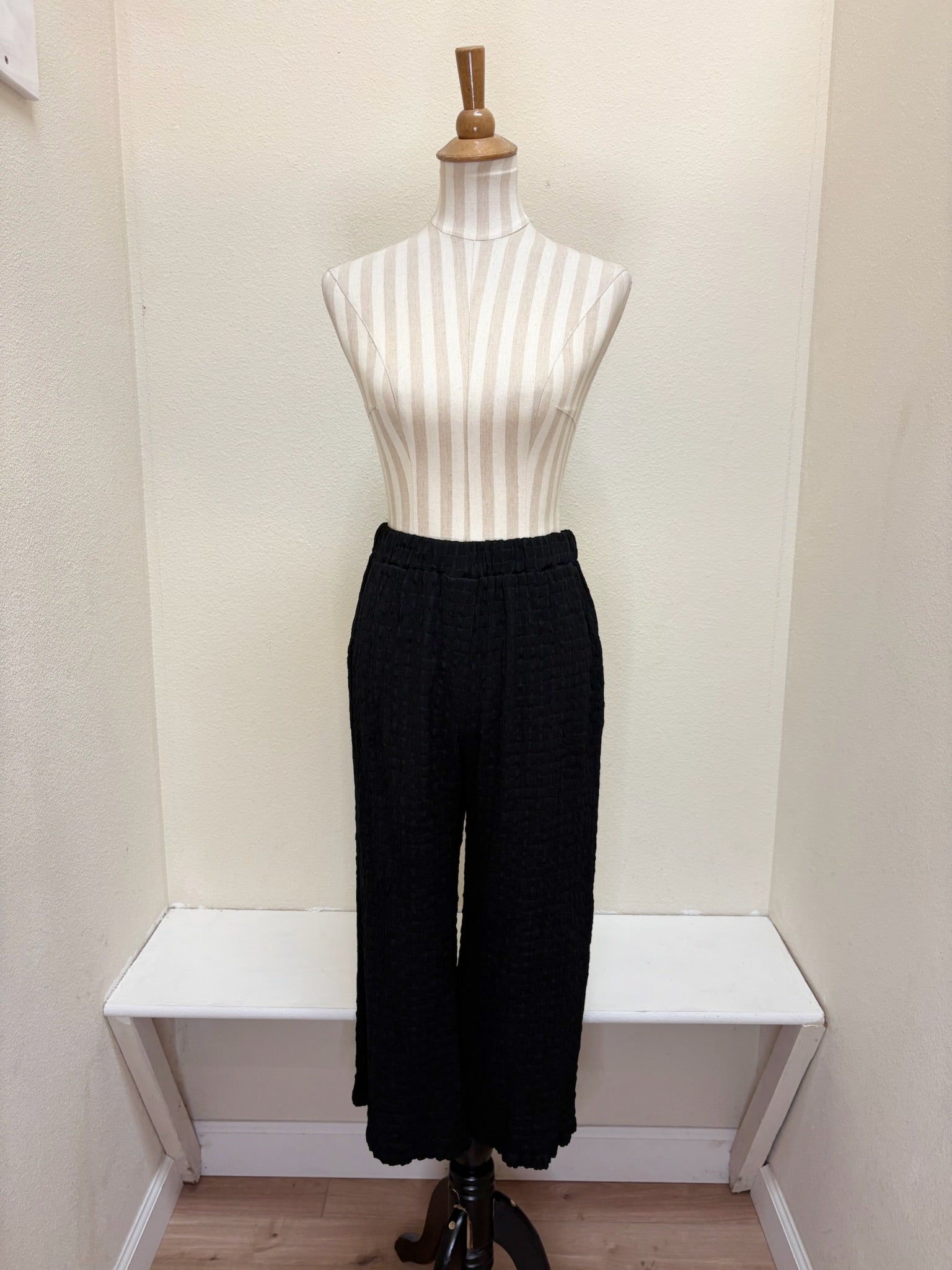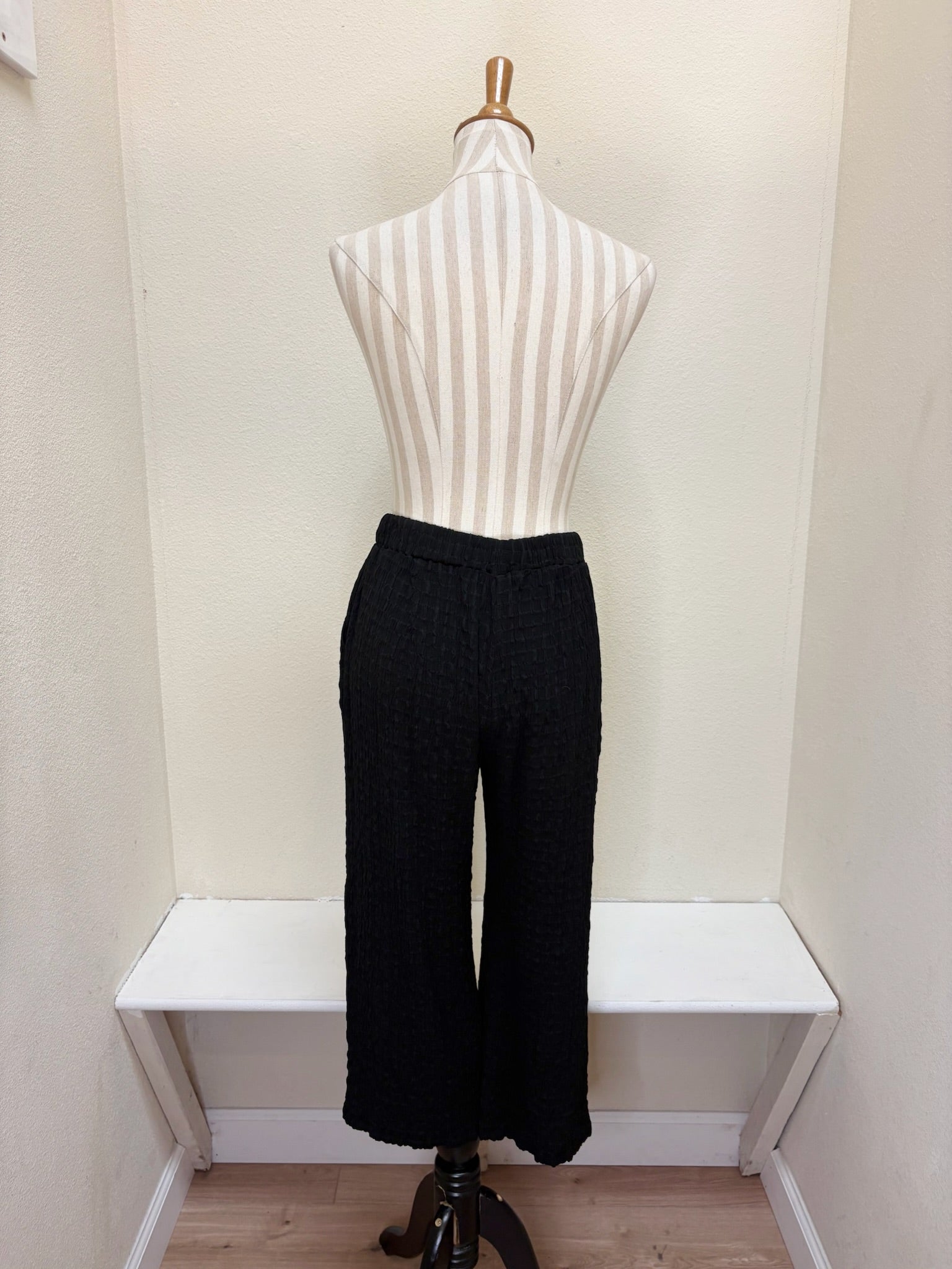 Cut Loose - your "go-to" pieces! A wonderful fabric and design! This black crinkle plaid easy crop features an elastic banded waist and side seam pockets. Made from a lightweight viscose blend, it is soft and comfortable. What a fun & playful addition to your wardrobe!