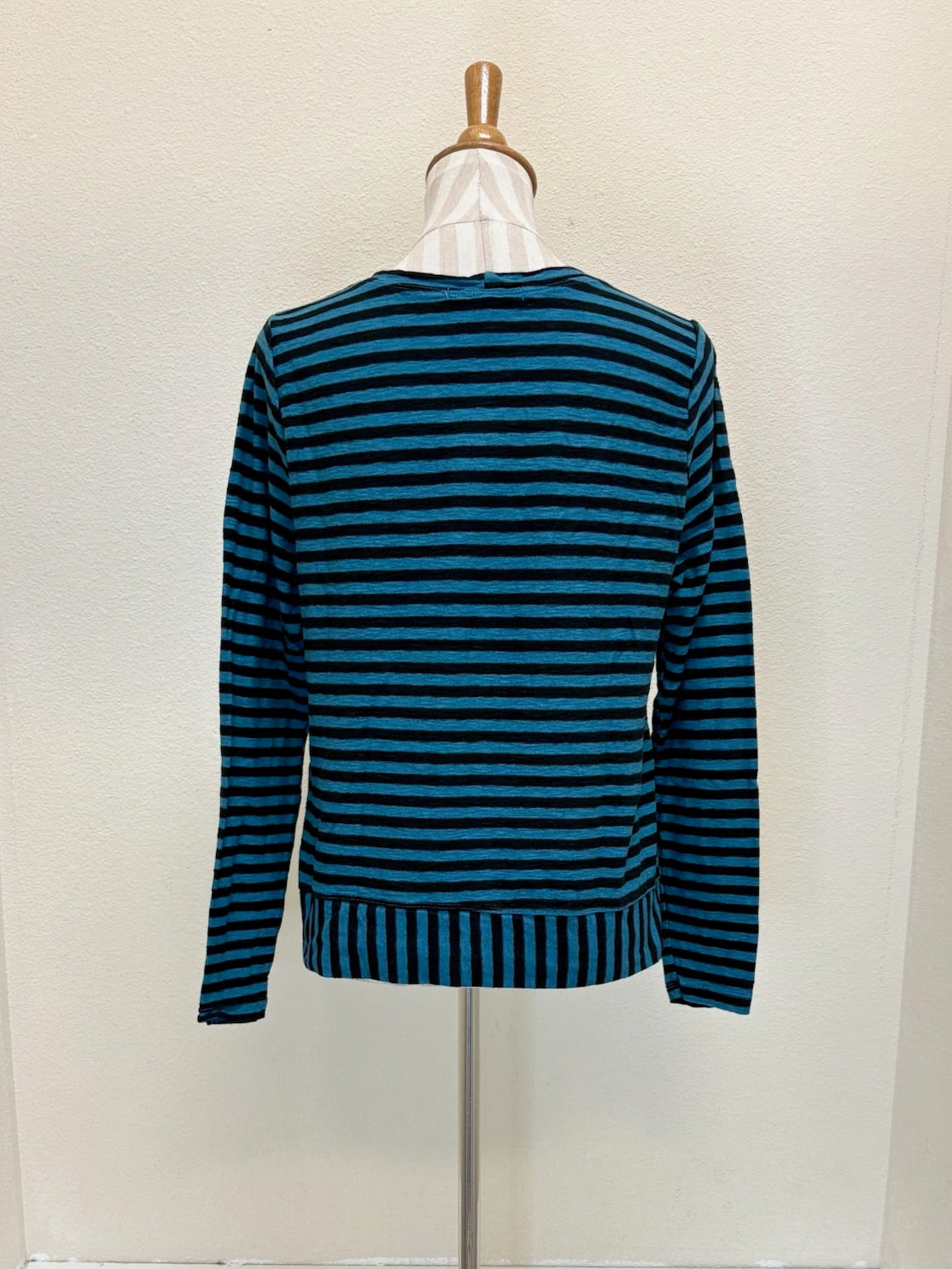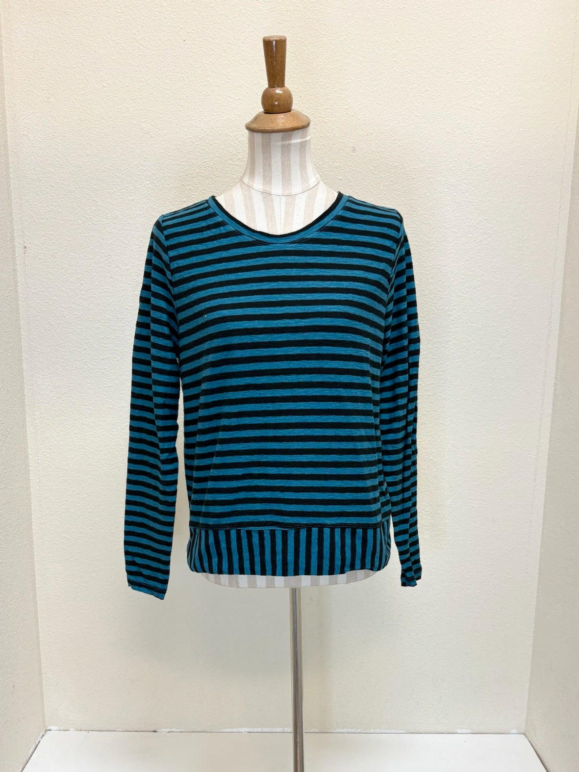 Cut Loose - your "go-to" pieces! A returning fabric and design! This black stripe crop top features a round neck, long sleeves and a contrast banded hem. Made from cotton/linen jersey, it is soft and comfortable. A perfect layering piece!