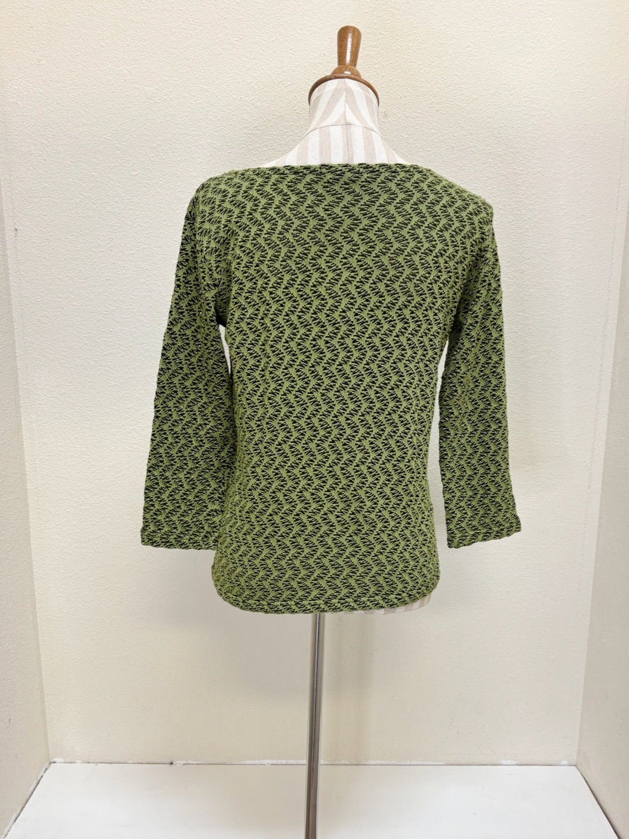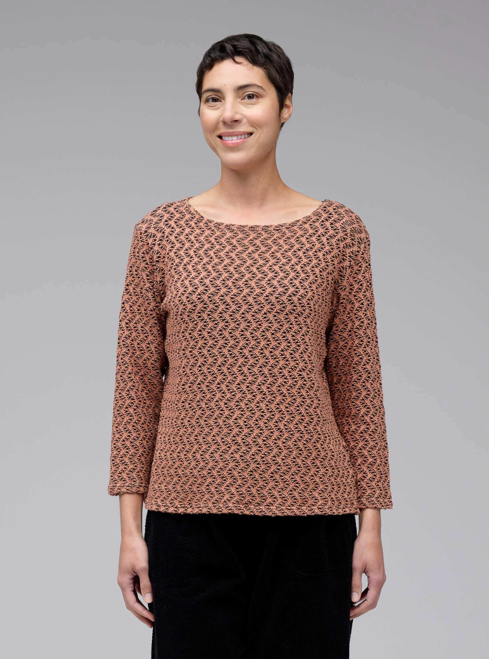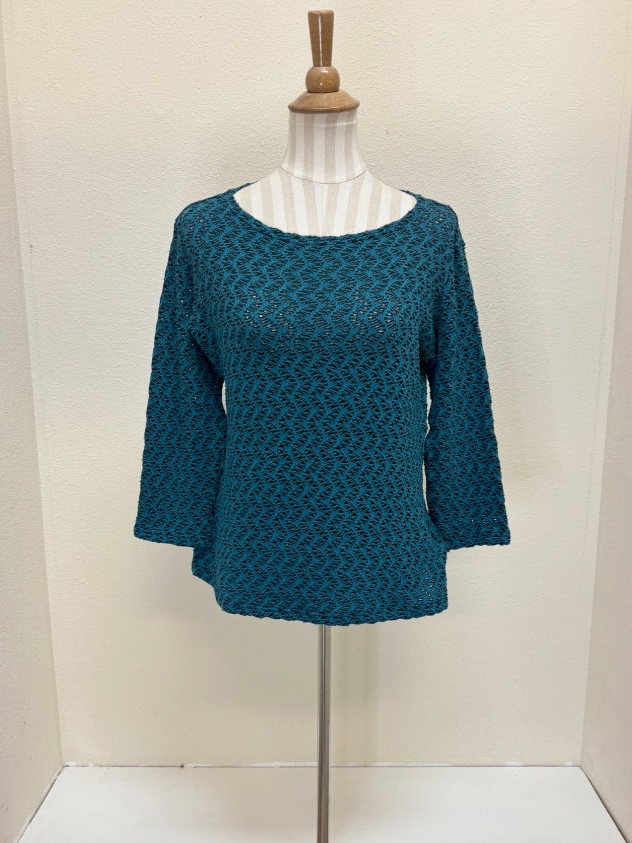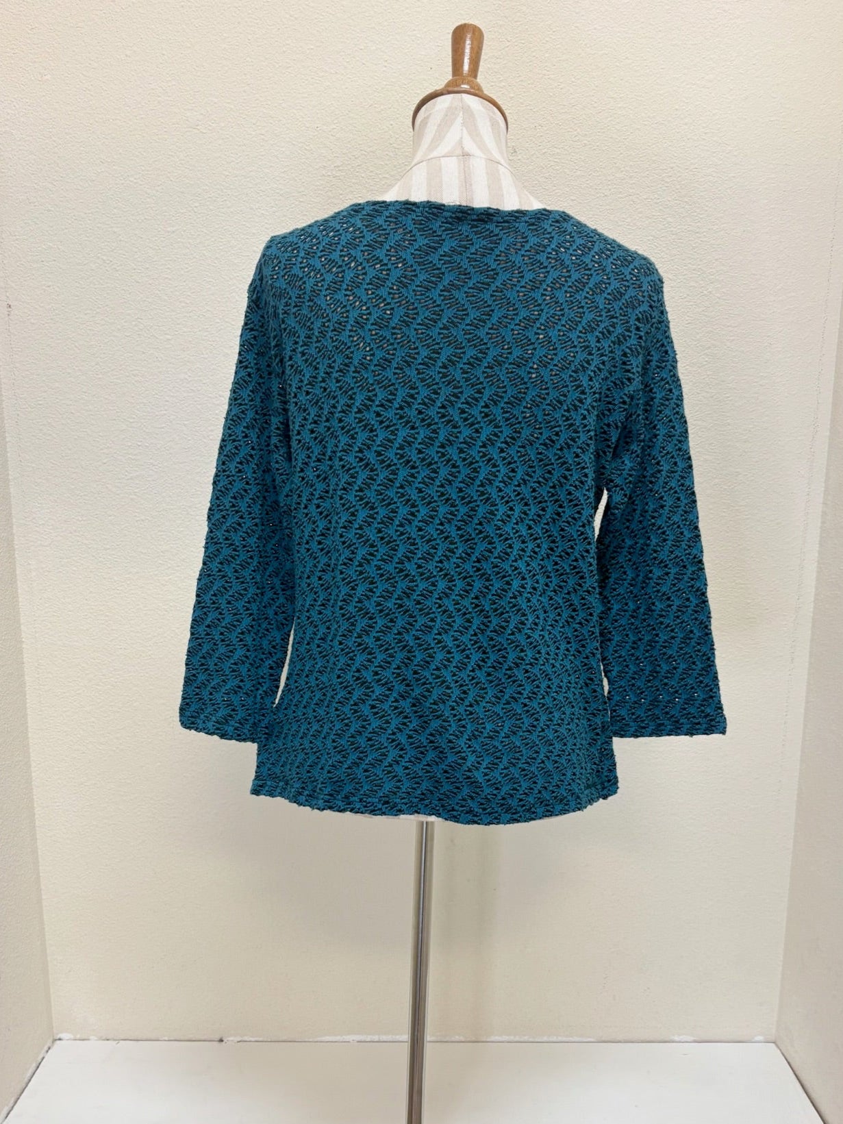 Cut Loose - your "go-to" pieces! A new fabric and design! This blk/nat crochet tee features a boatneck, 3/4 sleeves and a straight cut. Made from a soft & comfortable cotton blend, it is the perfect addition to your fall wardrobe.