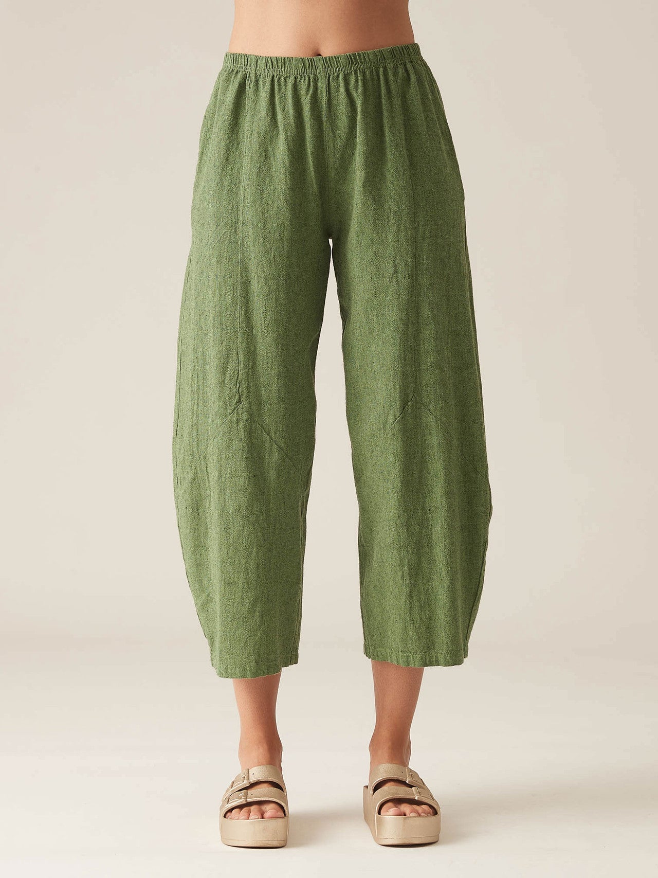 Cut Loose - your "go-to" pieces! A returning fabric and design! This crosshatch barrel crop pant features a gathered, elastic waist, seam detail and a cropped fit. The linen/cotton natural fabric blend is lightweight and airy. A perfect Spring piece!