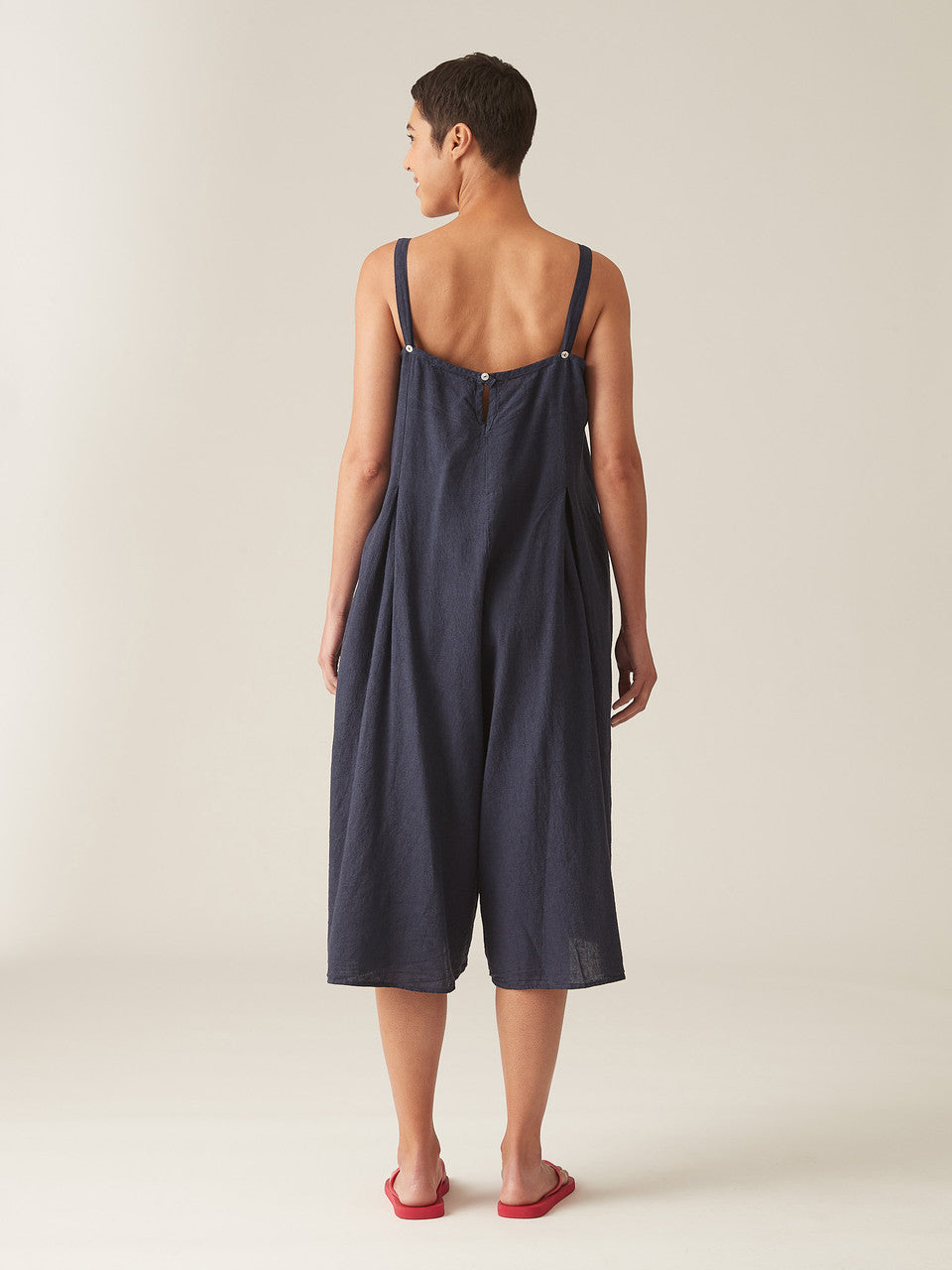 Cut Loose - your "go-to" pieces! A returning fabric and design! This crosshatch crop jumpsuit features a straight neck, adjustable straps, pleat detail and a wide leg. The linen/cotton natural fabric blend is lightweight and airy. A perfect Spring piece!