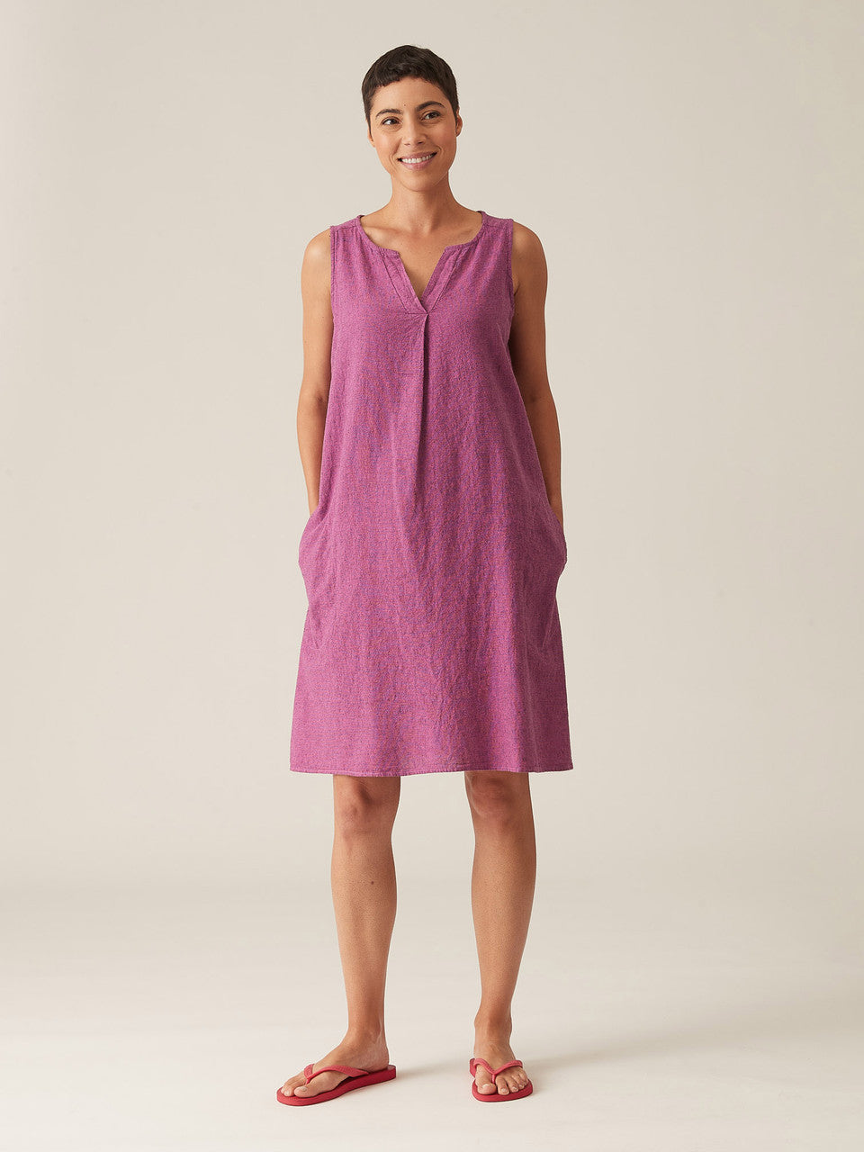 Cut Loose - your "go-to" pieces! A returning fabric and design! This crosshatch sleeveless shift dress features a split neck, pleat detail and an A-line cut. The linen/cotton natural fabric blend is lightweight and airy. A perfect Spring piece!