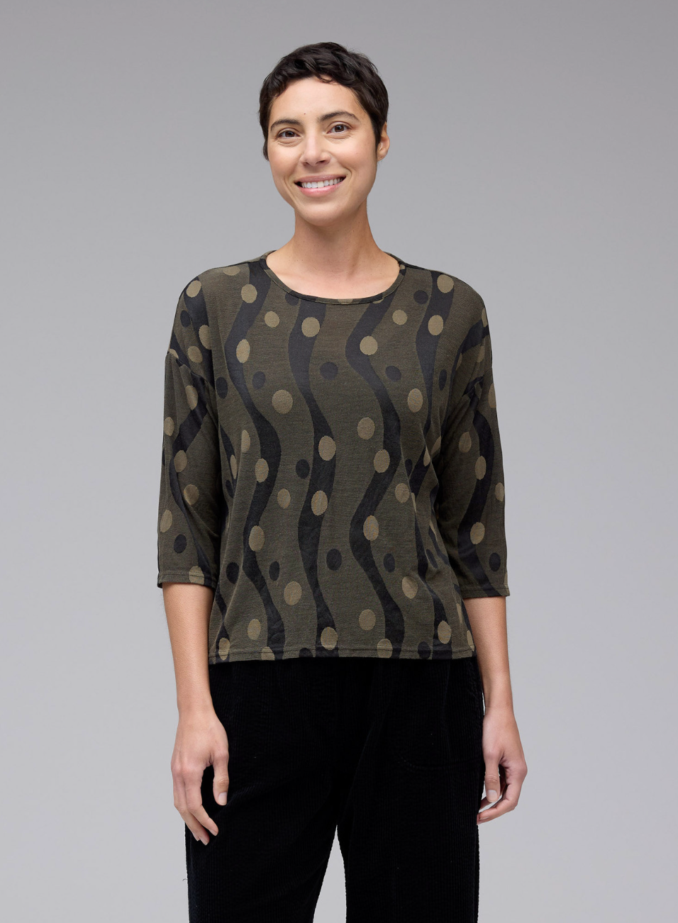 Cut Loose - your "go-to" pieces! A returning fabric and design! This dot jacquard tee features a crew neck, drop shoulder 3/4 sleeves and a straight cut. Made from a soft & comfortable fabric. We love the playful and arty design for fall!