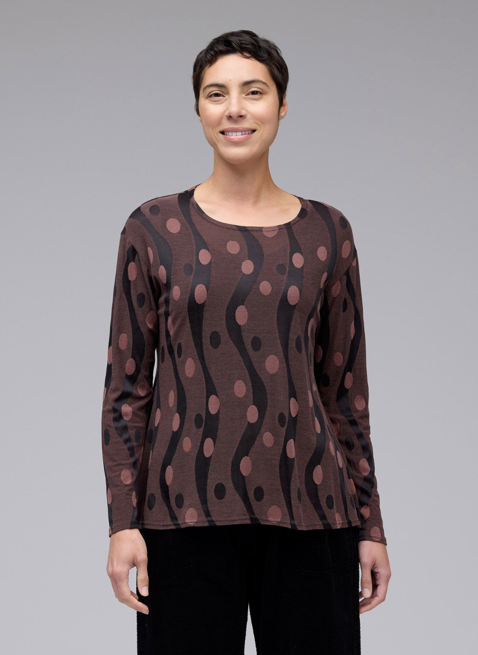 Cut Loose - your "go-to" pieces! A returning fabric and design! This dot jacquard swing tee features a round neck, long sleeves and a swing hem. Made from a soft & comfortable fabric. We love the playful and arty design for fall!