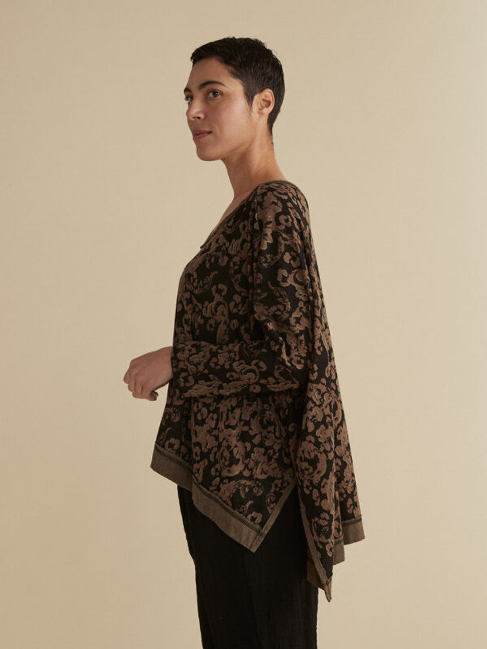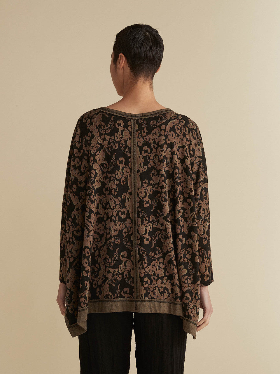 Cut Loose - your "go-to" pieces! A returning fabric and design! This floral jacquard OS deep V tee features a v-neck, long sleeves and a hi-low hem with side slits. Made from viscose stretch, this piece is mid-weight, soft and comfortable. Love this look for fall!