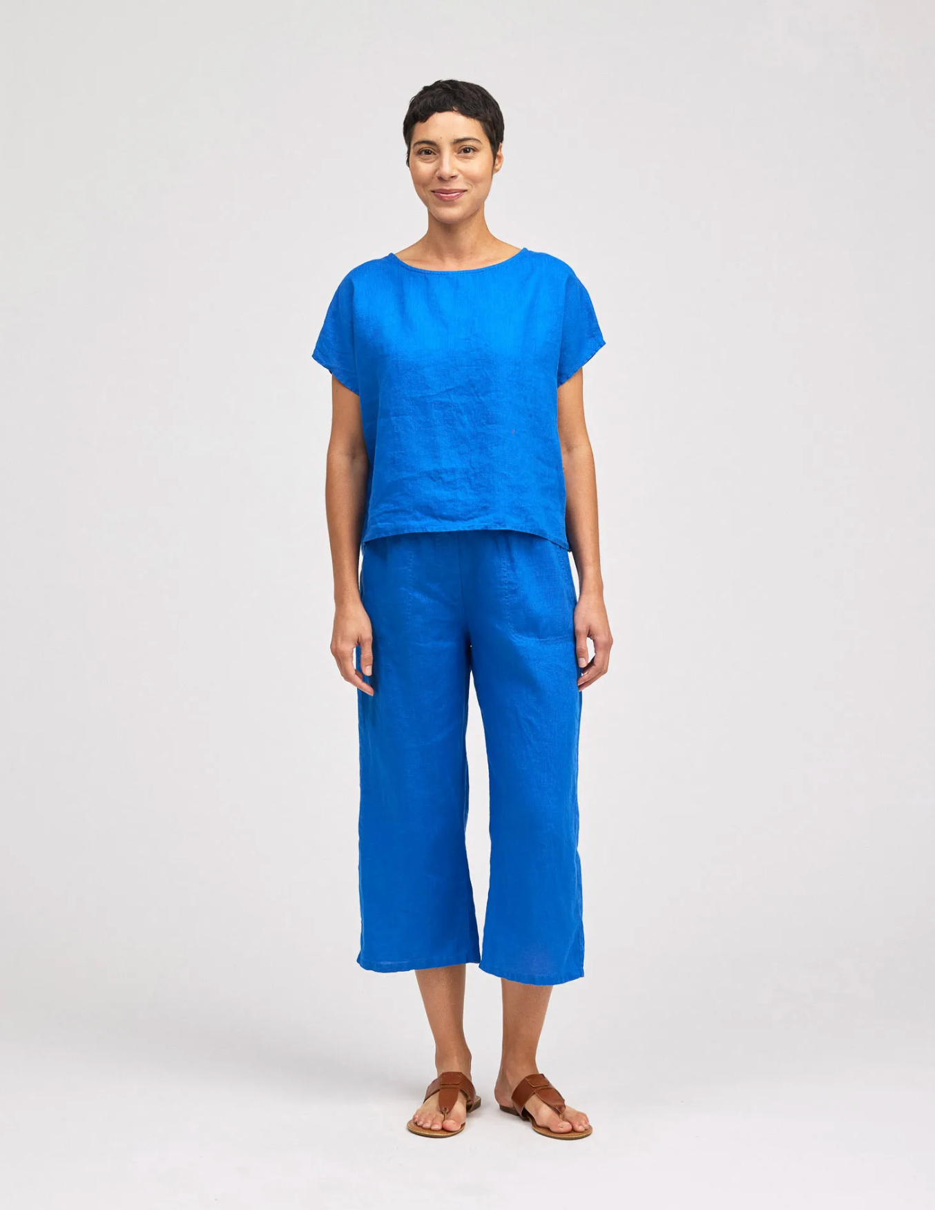 The model is wearing Vivid Blue.