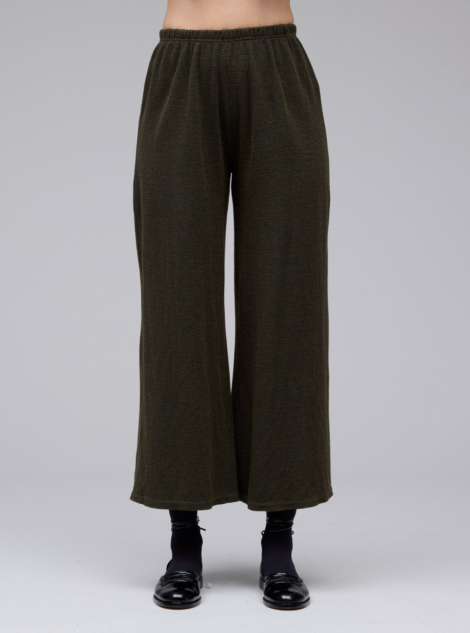 Cut Loose  - your "go-to" pieces! A returning fabric and design! This marled sweater knit cropped pant features an elastic waist, a wide leg and a cropped cut. Made from a soft knit, keep it casual or elevate this beautiful piece.