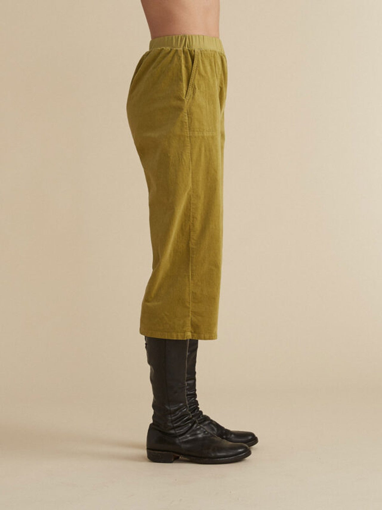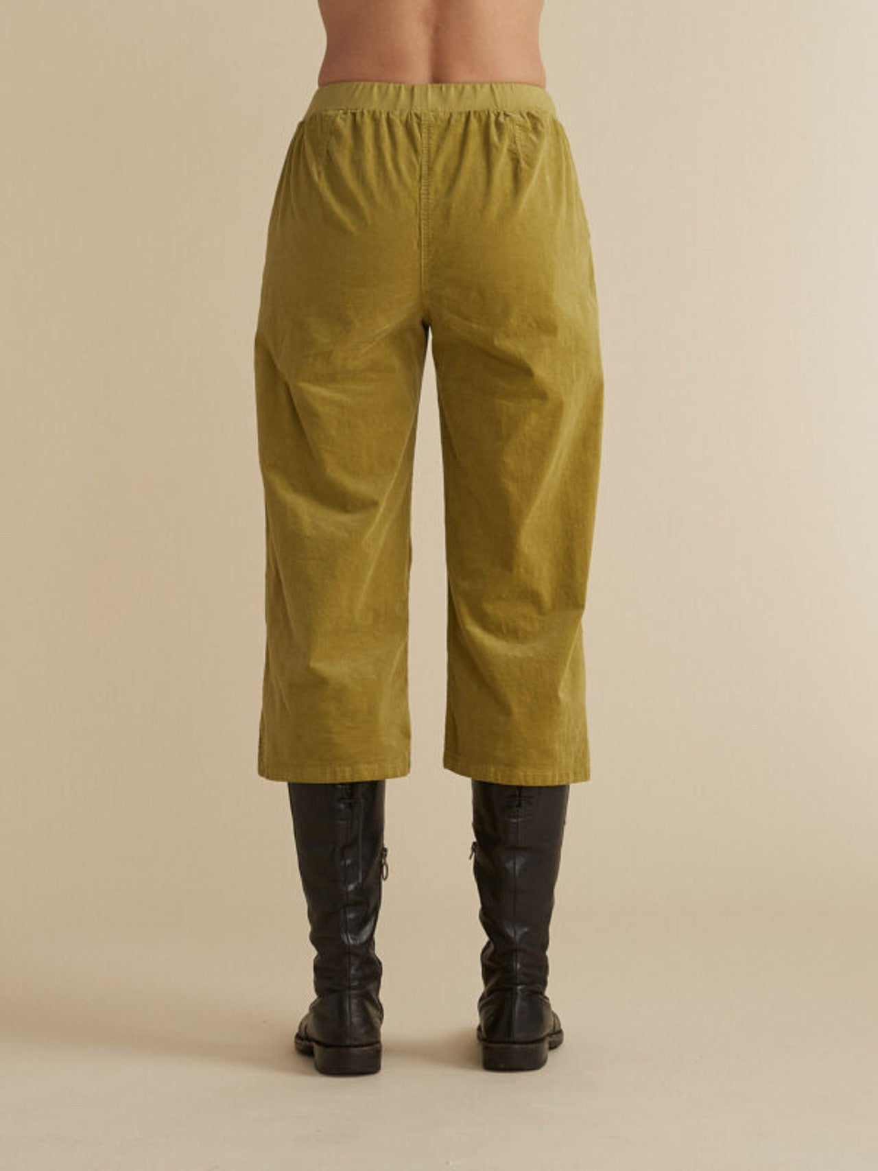 Cut Loose - your "go-to" pieces! A returning fabric and design! This mini cord easy crop pant features an elastic gathered waist, side seam pockets and a straight cropped leg. Made from cotton stretch, this piece is mid-weight and will make an excellent addition to your fall wardrobe.