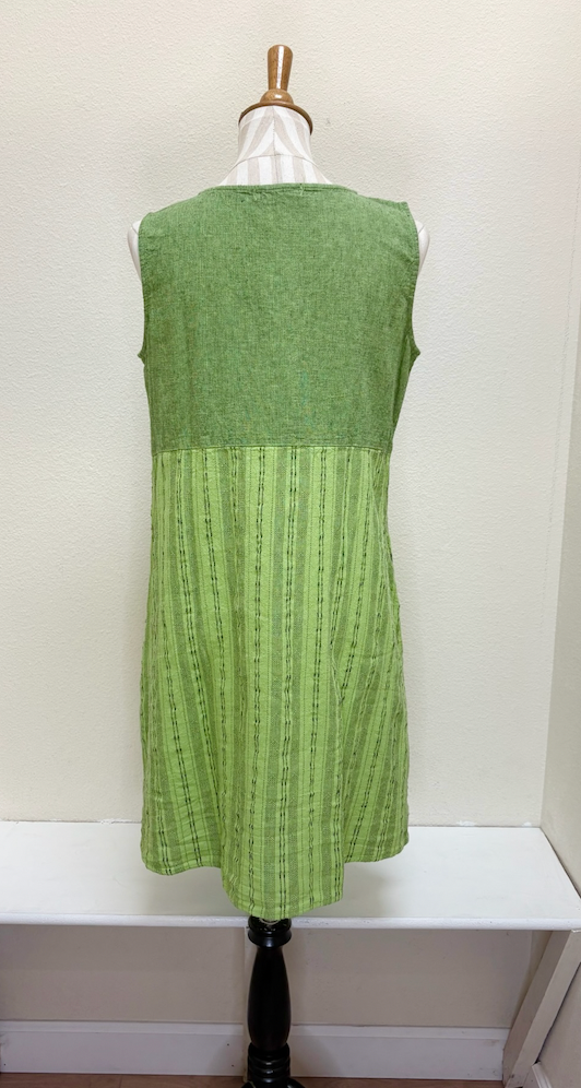 Cut Loose - your "go-to" pieces! A wonderful fabric and design! This pinstripe linen patch dress features a v-neck, side seam pockets and a fun patch style. Made from a linen cotton blend, it is breathable and comfortable. A wonderful wardrobe addition!