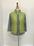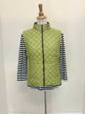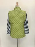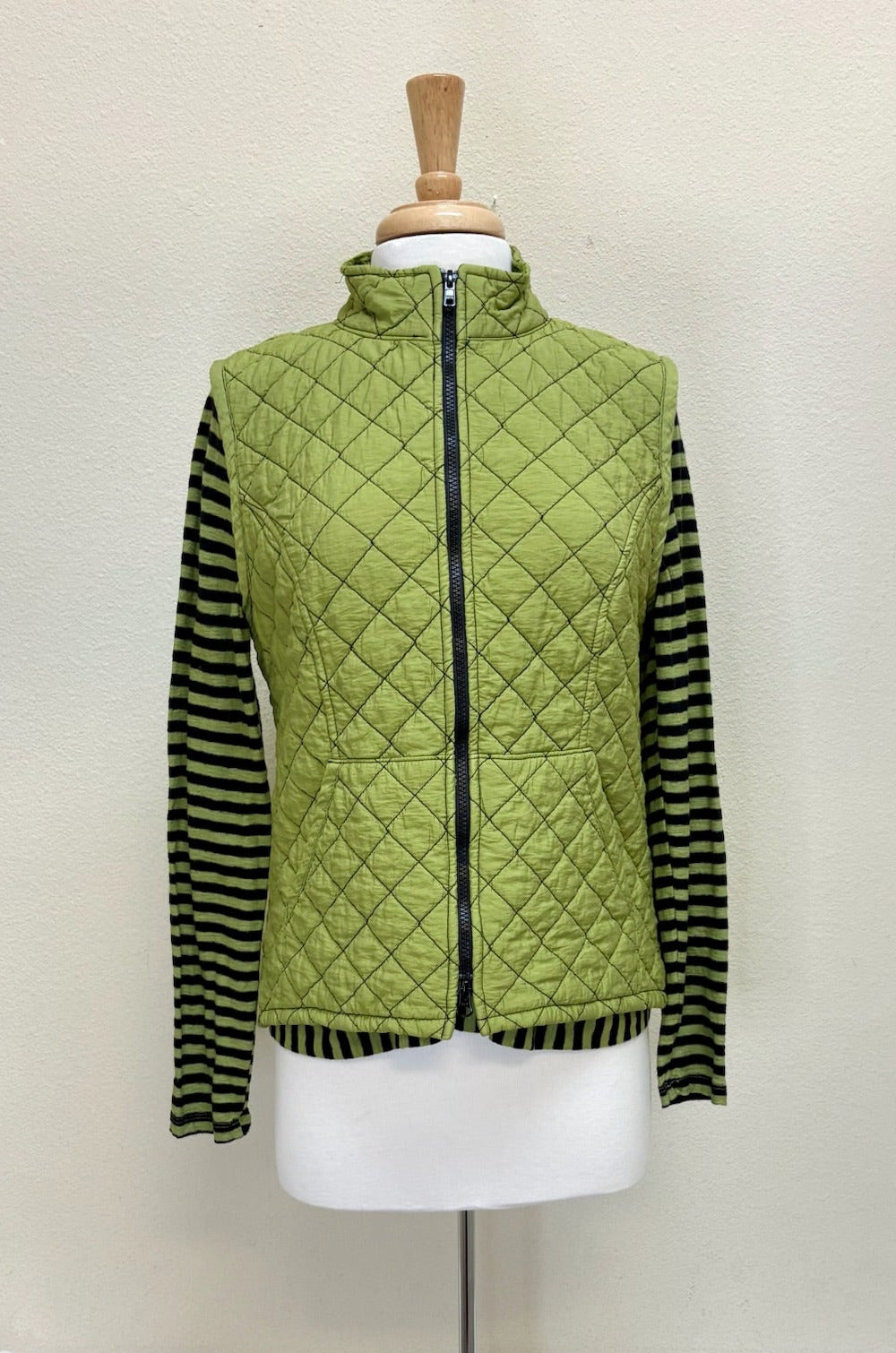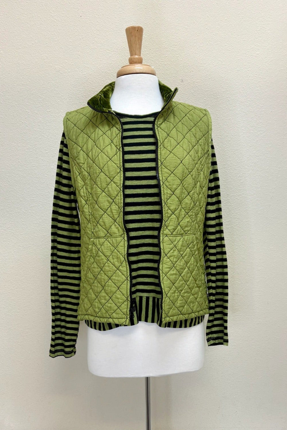 Cut Loose - your "go-to" pieces! A returning fabric and design! This quilted parachute zip front vest features a zip front to a collar, sleeveless, seam detail and pockets. Made from a mid-weight quilted fabric, it is cozy and perfect for fall.