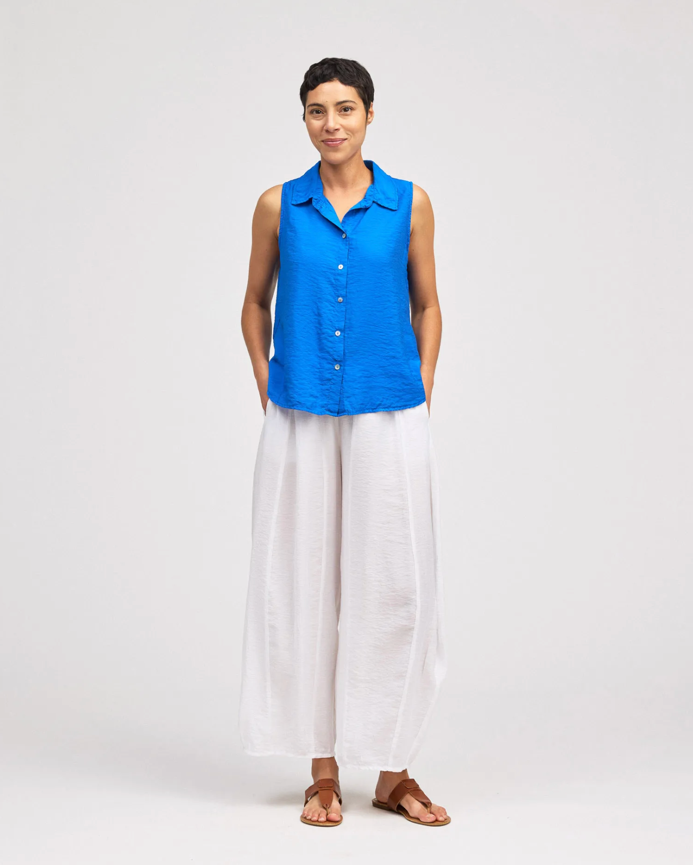 The model is wearing Vivid Blue.