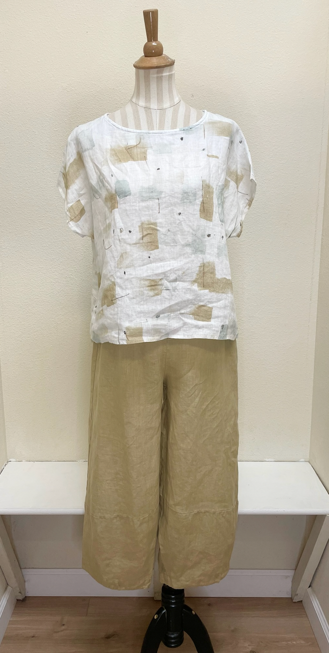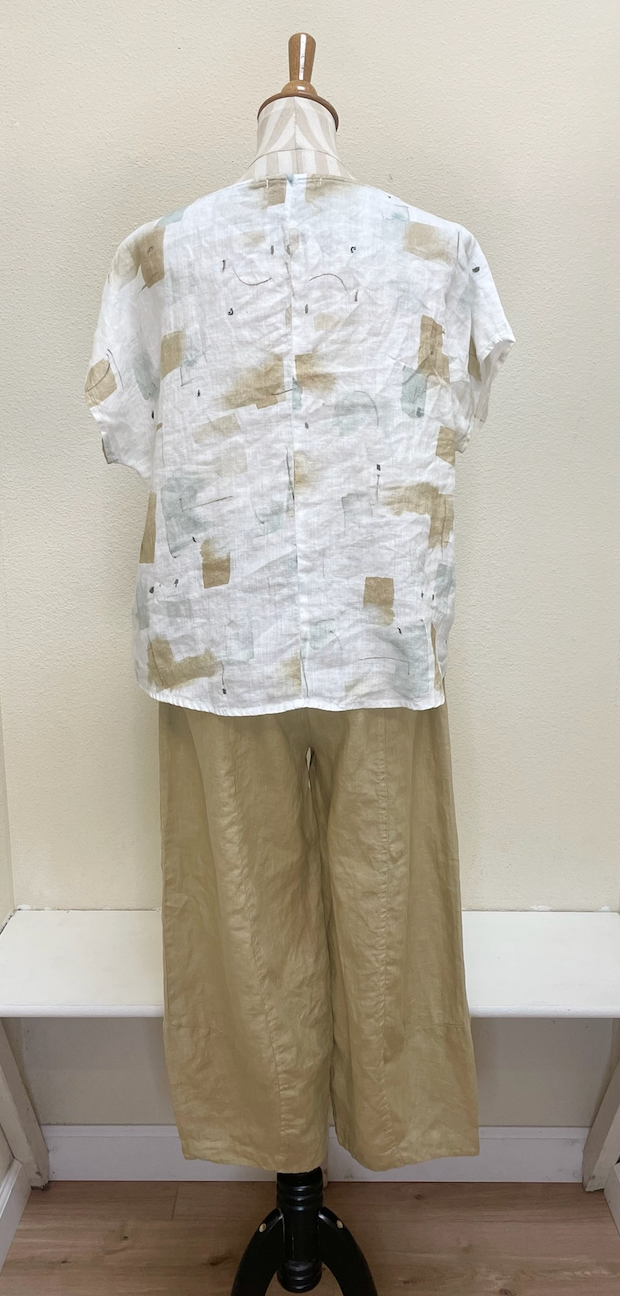 We love this piece paired with the Cut Loose Hanky Linen Lantern Pant & the Brush Stroke Side Slit Skirt!