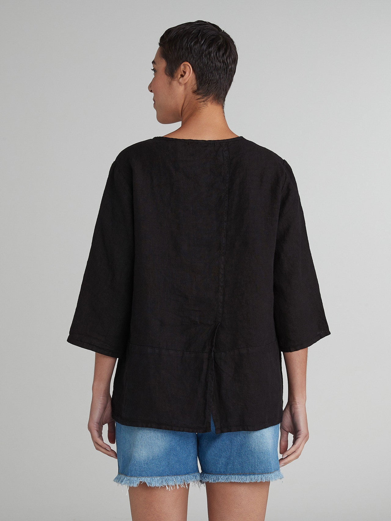 Cut Loose  - your "go-to" pieces! A wonderful fabric and design! This solid linen pocket pullover features a round neck, 3/4 sleeves and two large front pockets. Made from solid linen, you'll love the design and fit. These are basics elevated to something special!