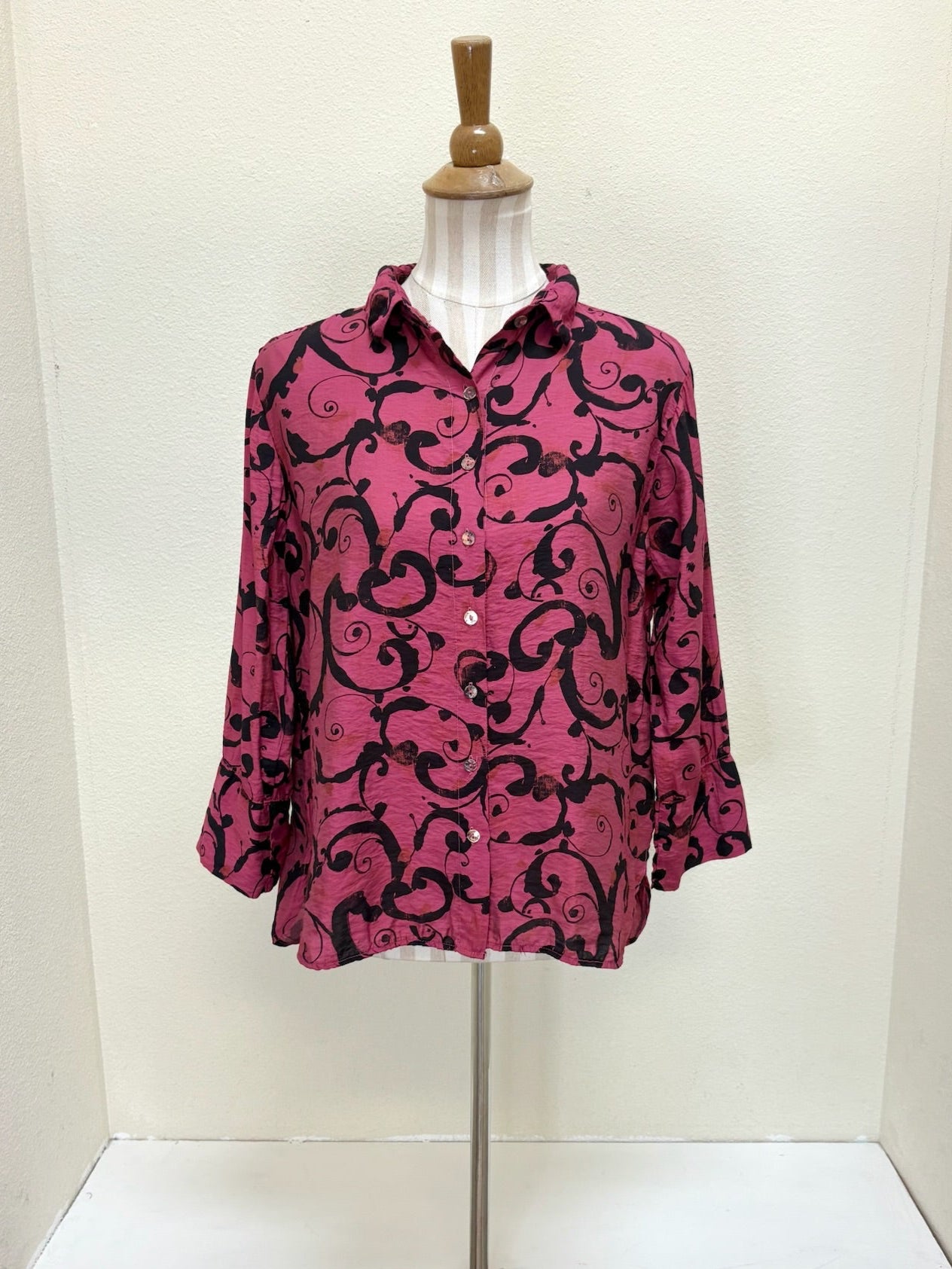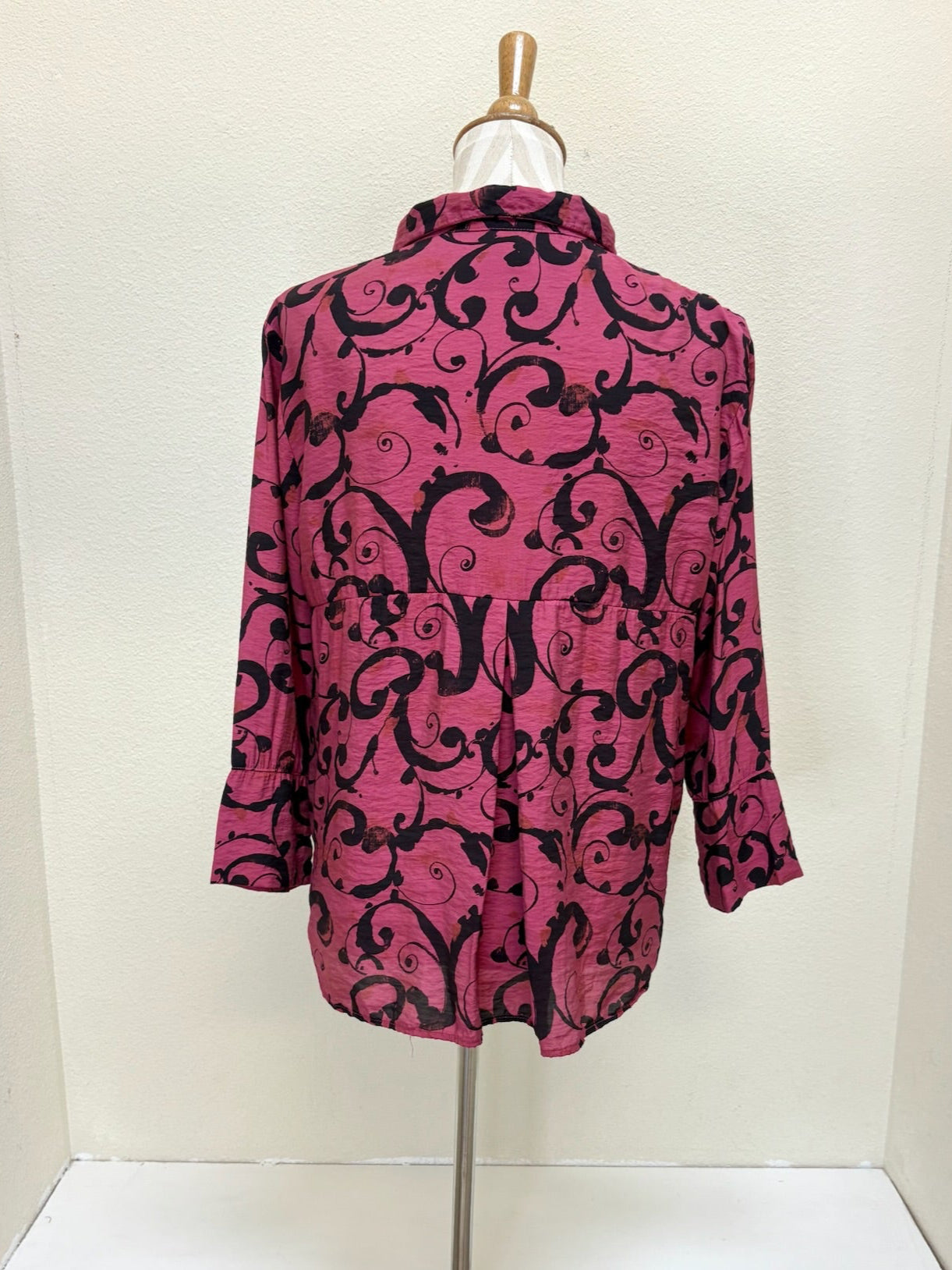 Cut Loose  - your "go-to" pieces! A returning fabric and new design! This swirl shirt features a button front to a collar, 3/4 sleeves, a hi-low hem, side slits and a pleat back. Made from light and airy fabric, it's a lovely fall layering piece.
