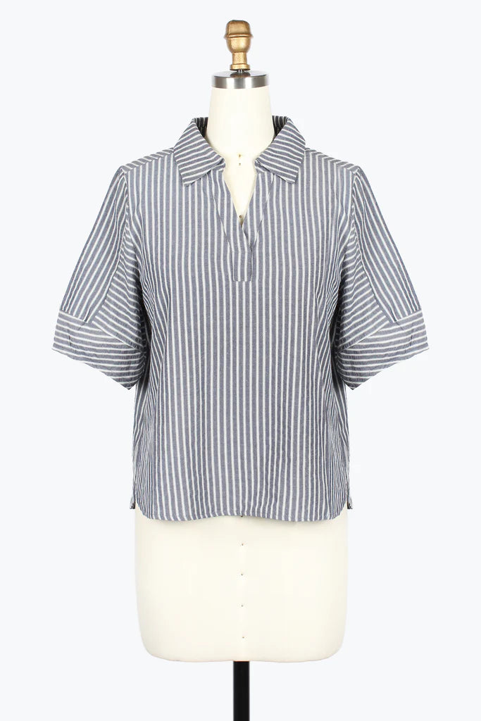 DAMEE STRIPE SEERSUCKER COLLARED V-NECK TOP - 9237-DNM