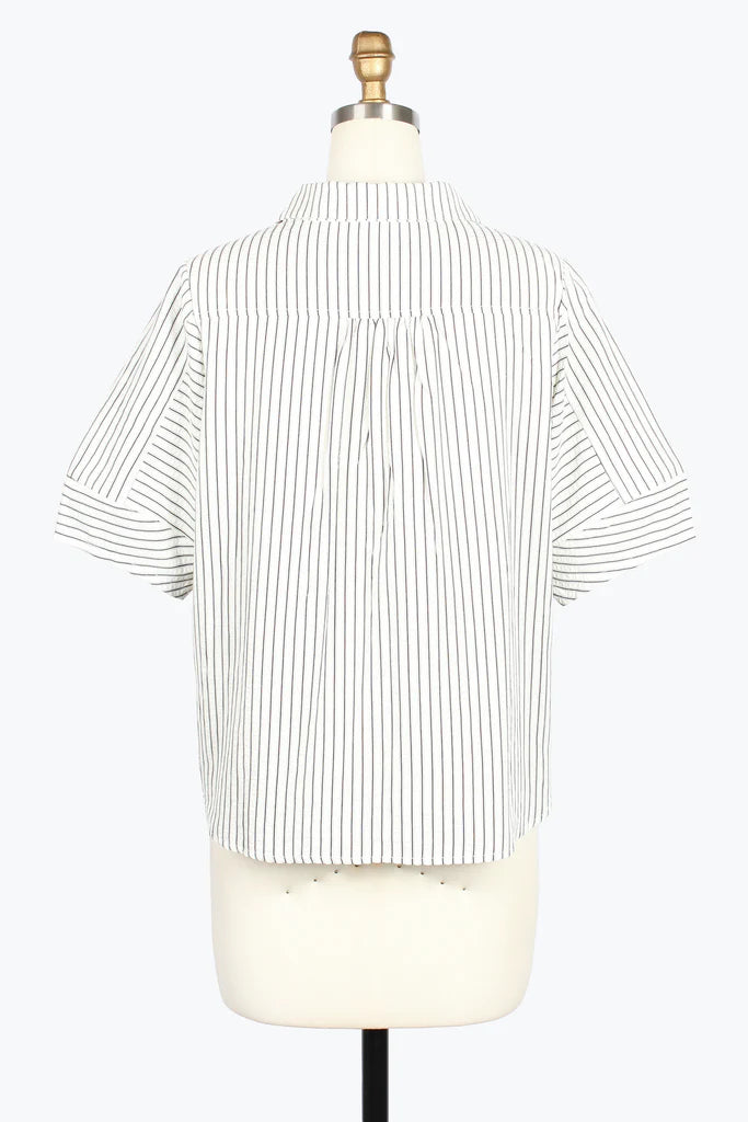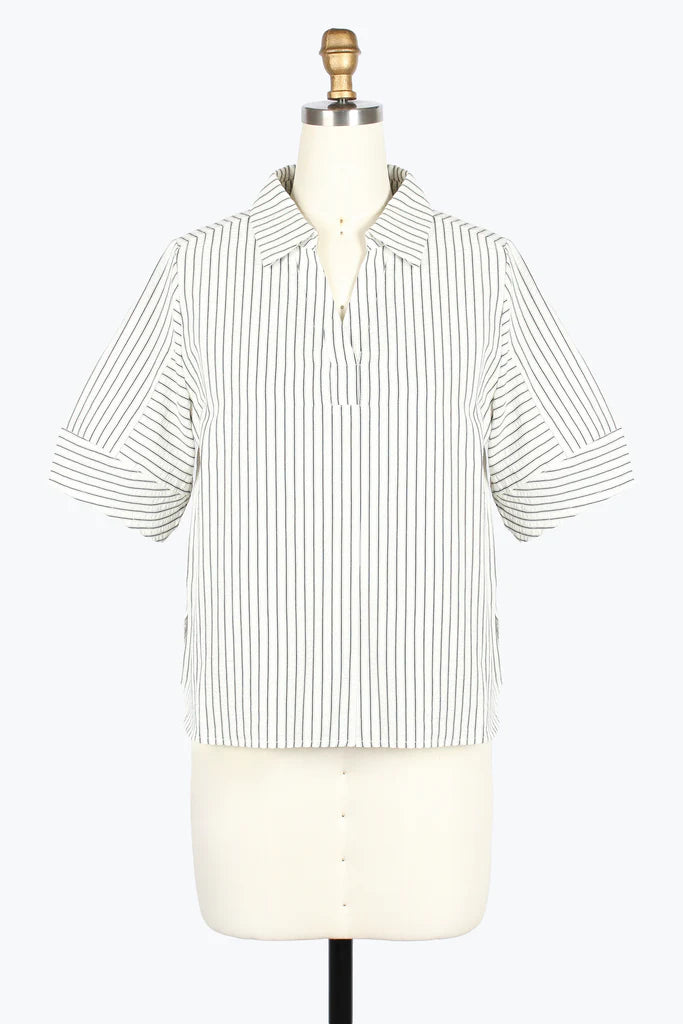 DAMEE STRIPE SEERSUCKER COLLARED V-NECK TOP - 9237-WHT