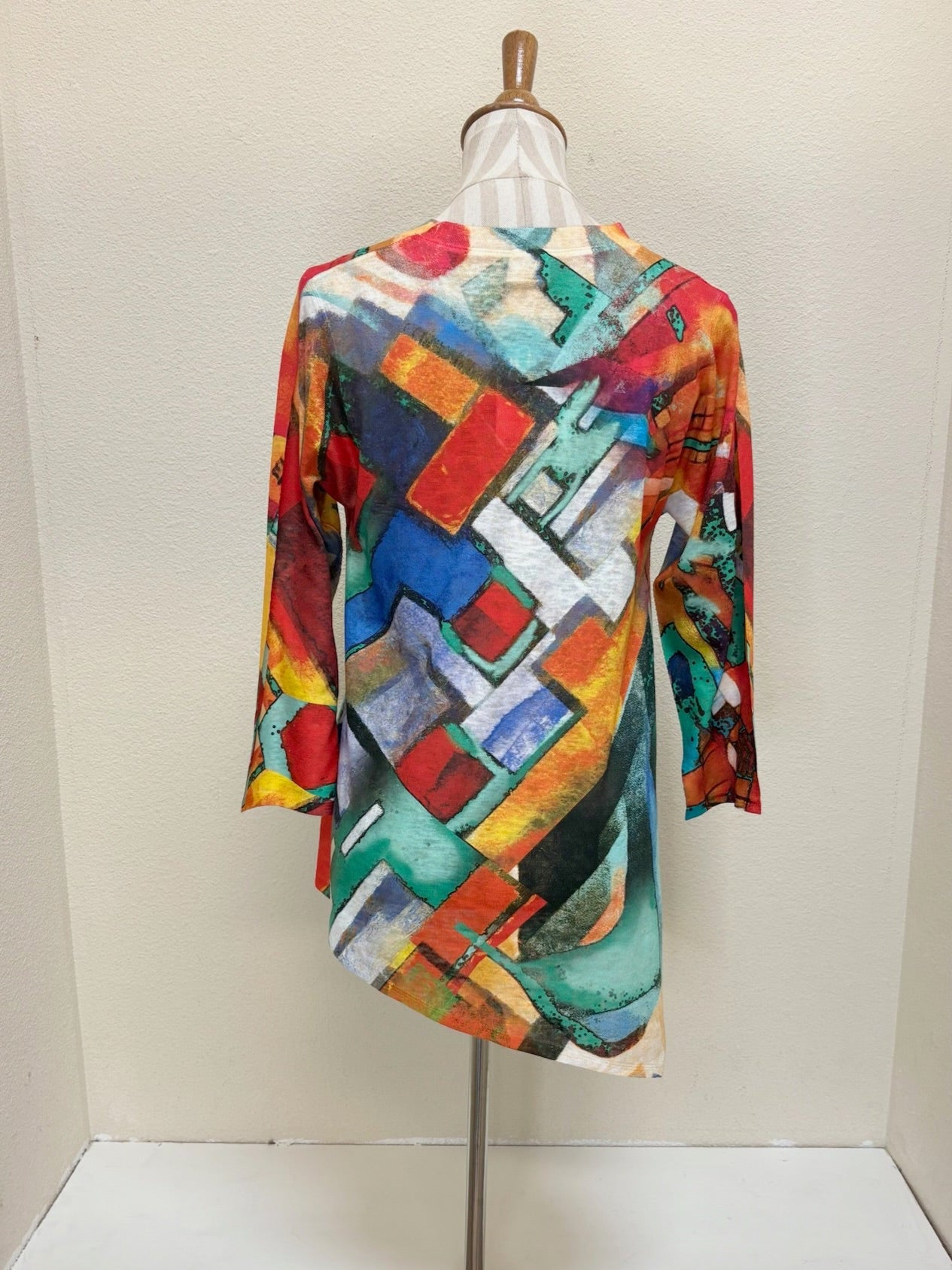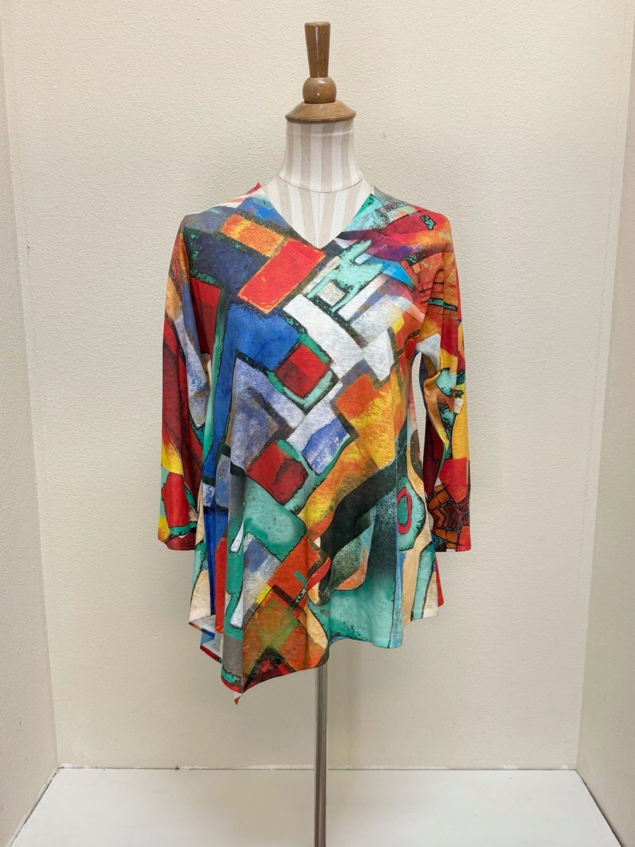 This colorful graphic print is the perfect pattern to dress up or down for endless outfit possibilities. Featured in the Et Lois Moon body, this top creates a flattering and comfortable fit with a 3/4 sleeve length, v-neck style and asymmetrical hemline. Don’t miss out on this incredible addition to your wardrobe!