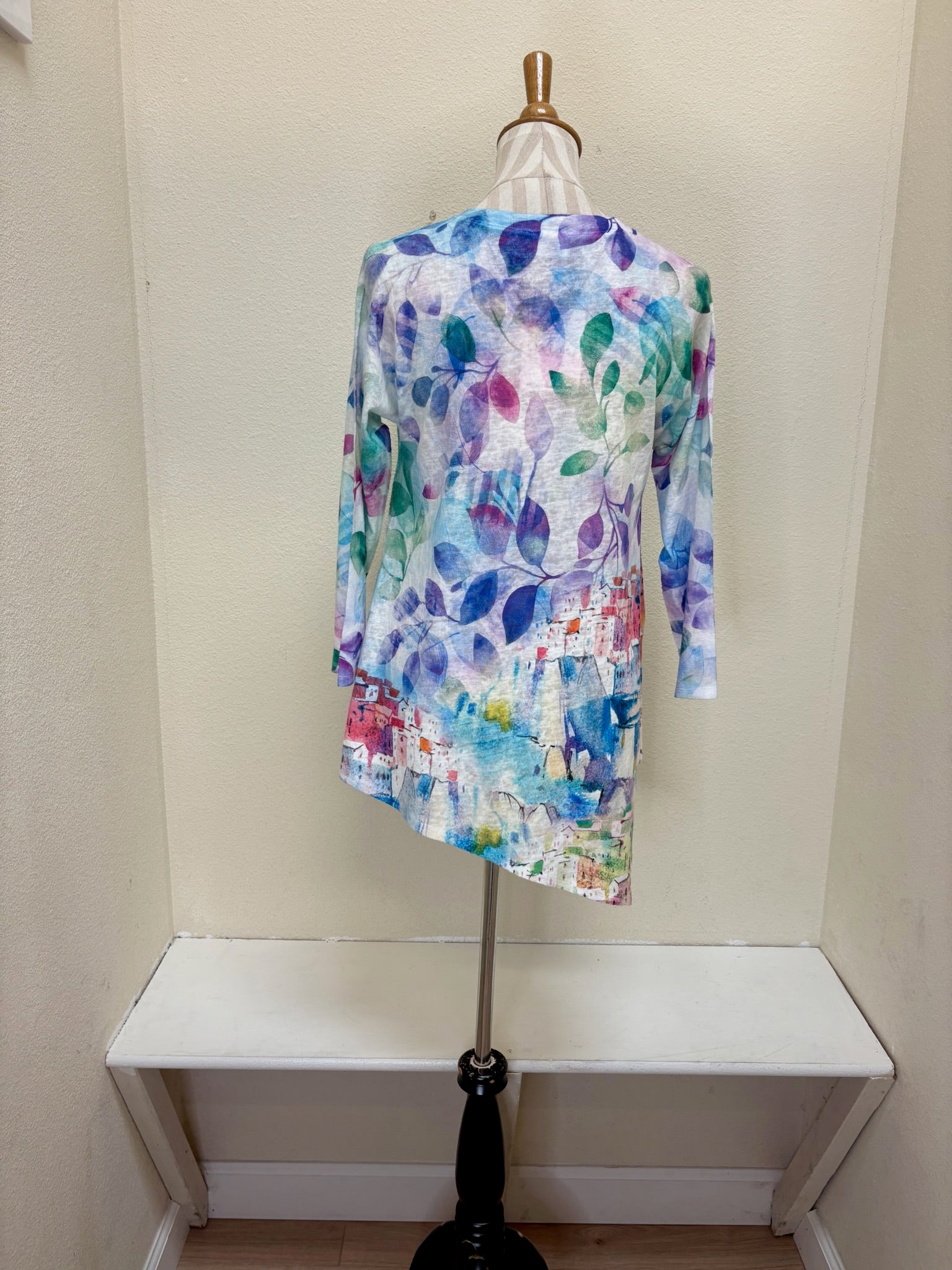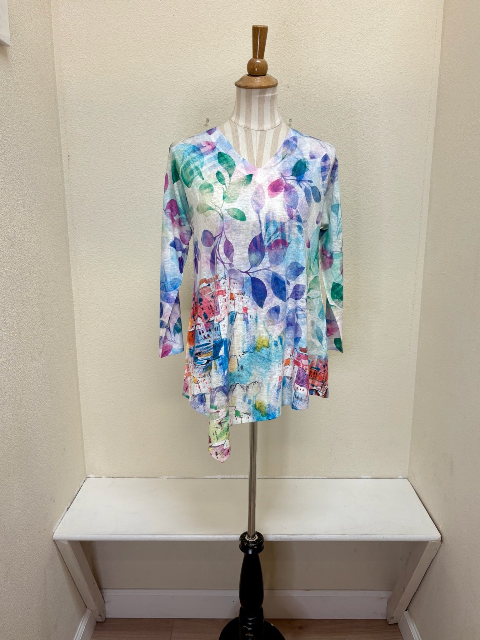 This abstract city-floral print is the perfect pattern to dress up or down for endless outfit possibilities. Featured in the Et Lois Moon body, this top creates a flattering and comfortable fit with a 3/4 sleeve length, v-neck style and asymmetrical hemline. Don’t miss out on this incredible addition to your wardrobe!