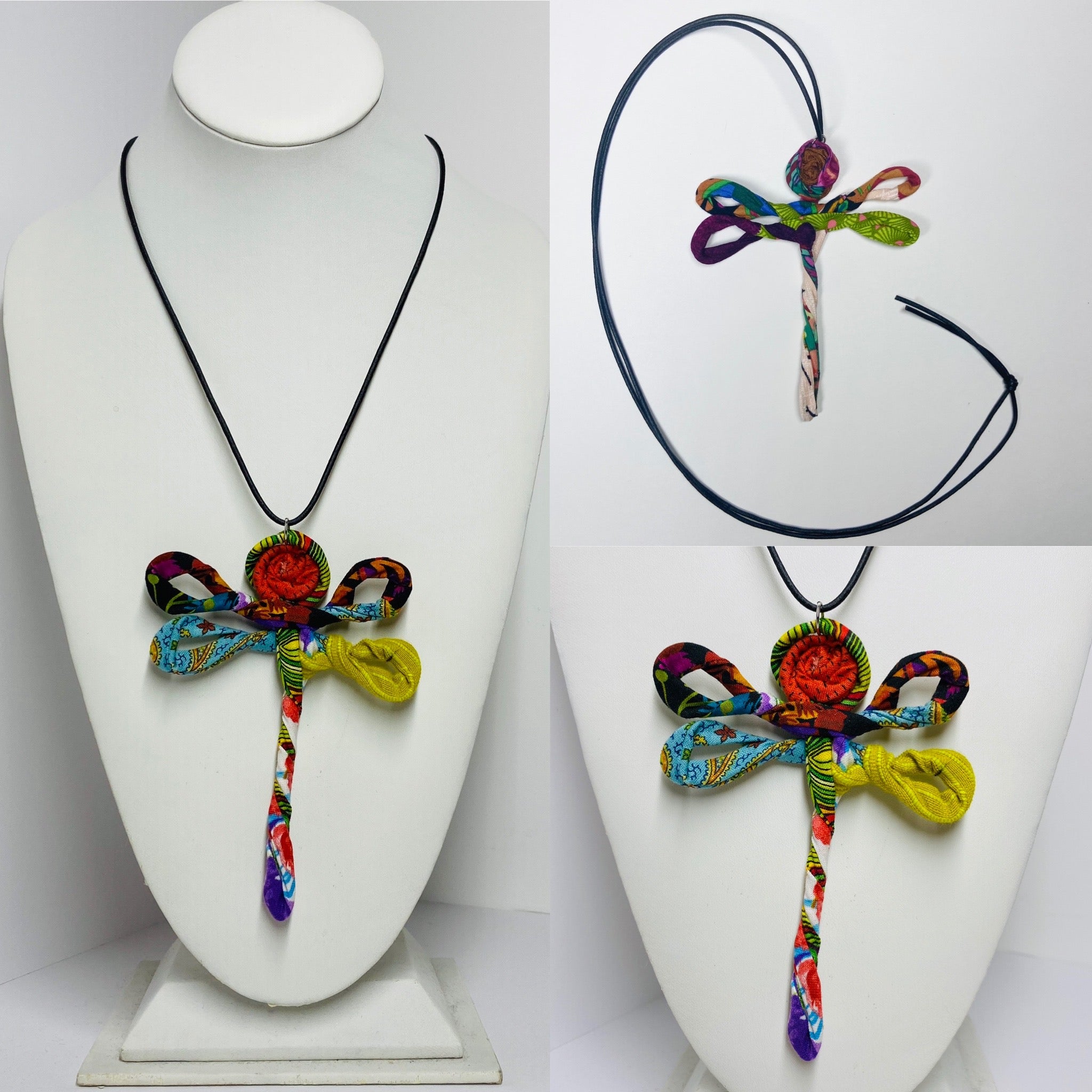 This colorful Dragonfly pendant features up to six different fabrics! We twist a 36” multi-fabric Ficklestick into a beautiful Dragonfly, and the wire inside the fabric allows it to hold it’s shape! Comes hanging from a thin, black cord.