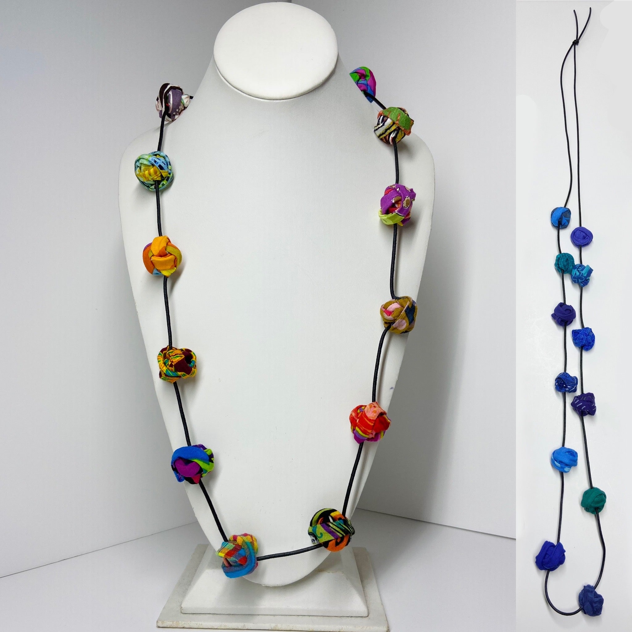 All necklaces come in a seasonal “multi” colorway and have their own flair and personality. Other color options include: Multi, Black and White, Neutrals, Reds, Blues, Comics, Chartreuse with Neon Cord, and Black with Neon Cord.