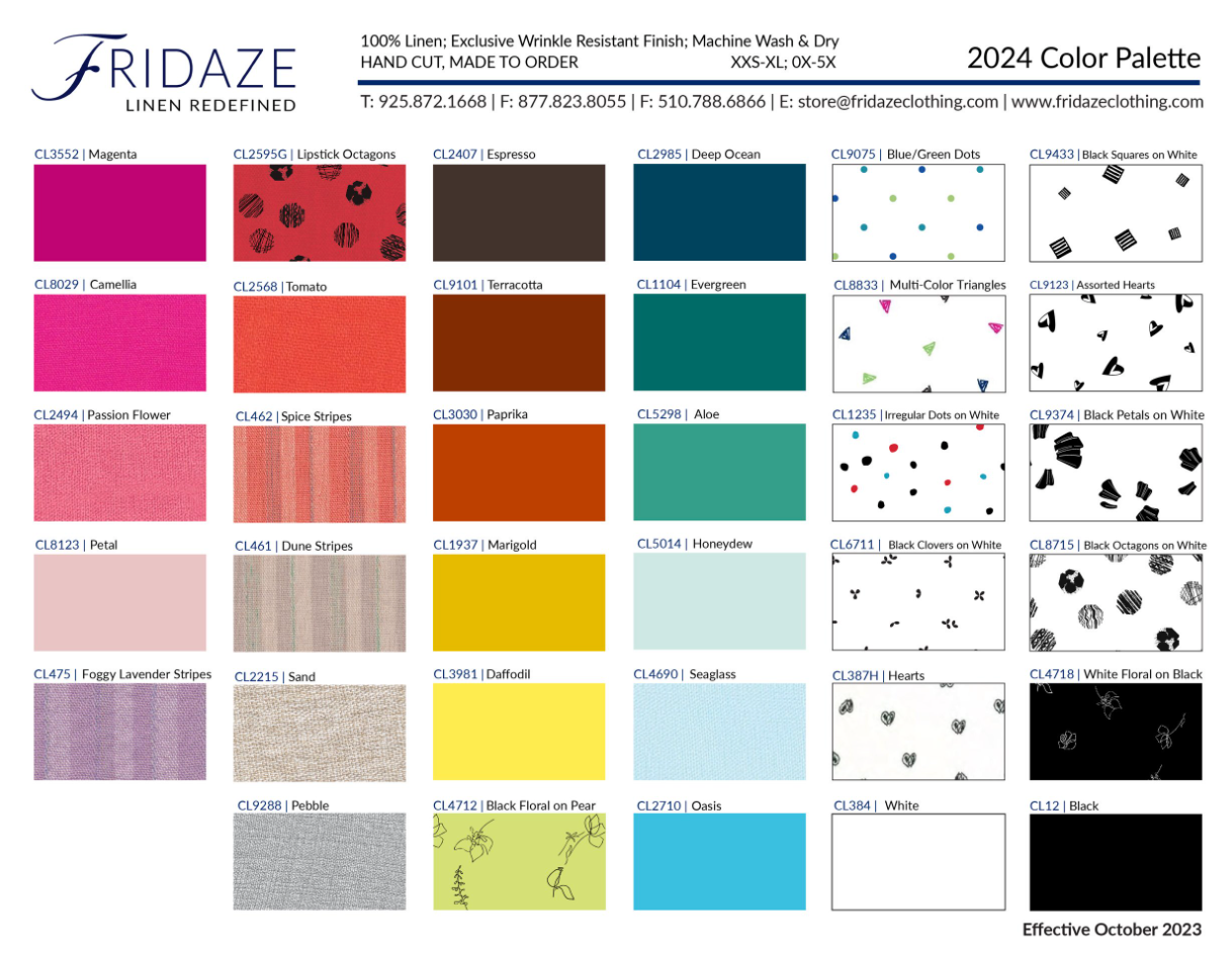 100% wrinkle resistant linen; machine wash and dry. Front/back pleat. Pointed collar. 3/4-sleeves. Hits at hip. French seams. 100% linen; lightweight, comfortable, and always smooth. Machine wash cold with like colors, tumble dry low, hang straight. Please note our sizes run generously. Our linen garments are perfect for every occasion: whether it be a day at the office, dinner with family, church on Sunday, or a much-needed vacation. The exquisite tailoring makes each piece great for special occasions, and the wrinkle-resistant fabric is ideal for travel. Fine tailoring is a key component of the Fridaze brand. All of our products are handmade. Every garment is hand-cut by a master tailor and finished with exacting details and French seams. Each Fridaze piece is truly a labor of love. Superior tailoring and highest craftsmanship. Two- three times higher thread count than other linens on the market today. Pre-washed and pre-shrunk; shape and color will not change wash after wash.