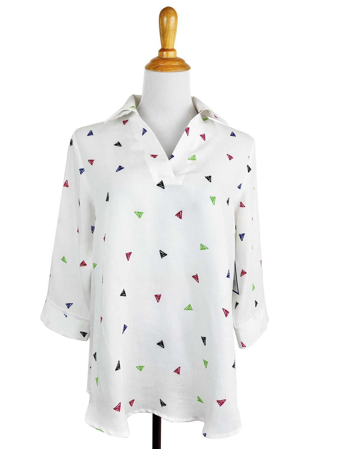 *Please note that the model is wearing Mauve, Basil, and Irregular Triangles on White to show the style of the shirt. Please choose a color based on the specific listing, other colors are available!