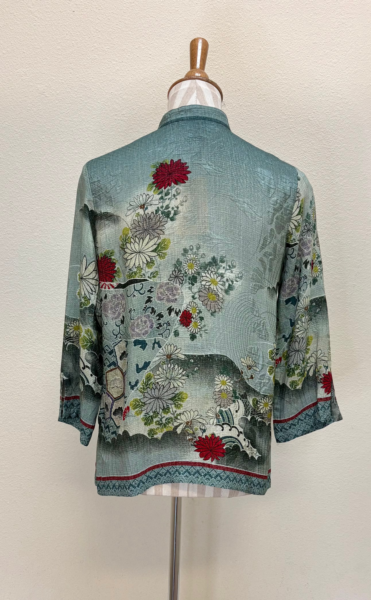Citron style blouse in our signature textured Silk Blend fabrication in a tonal blueish green pattern with a matching border on hem and sleeves. Mandarin collar and 3/4 sleeves with slits. Machine washable.