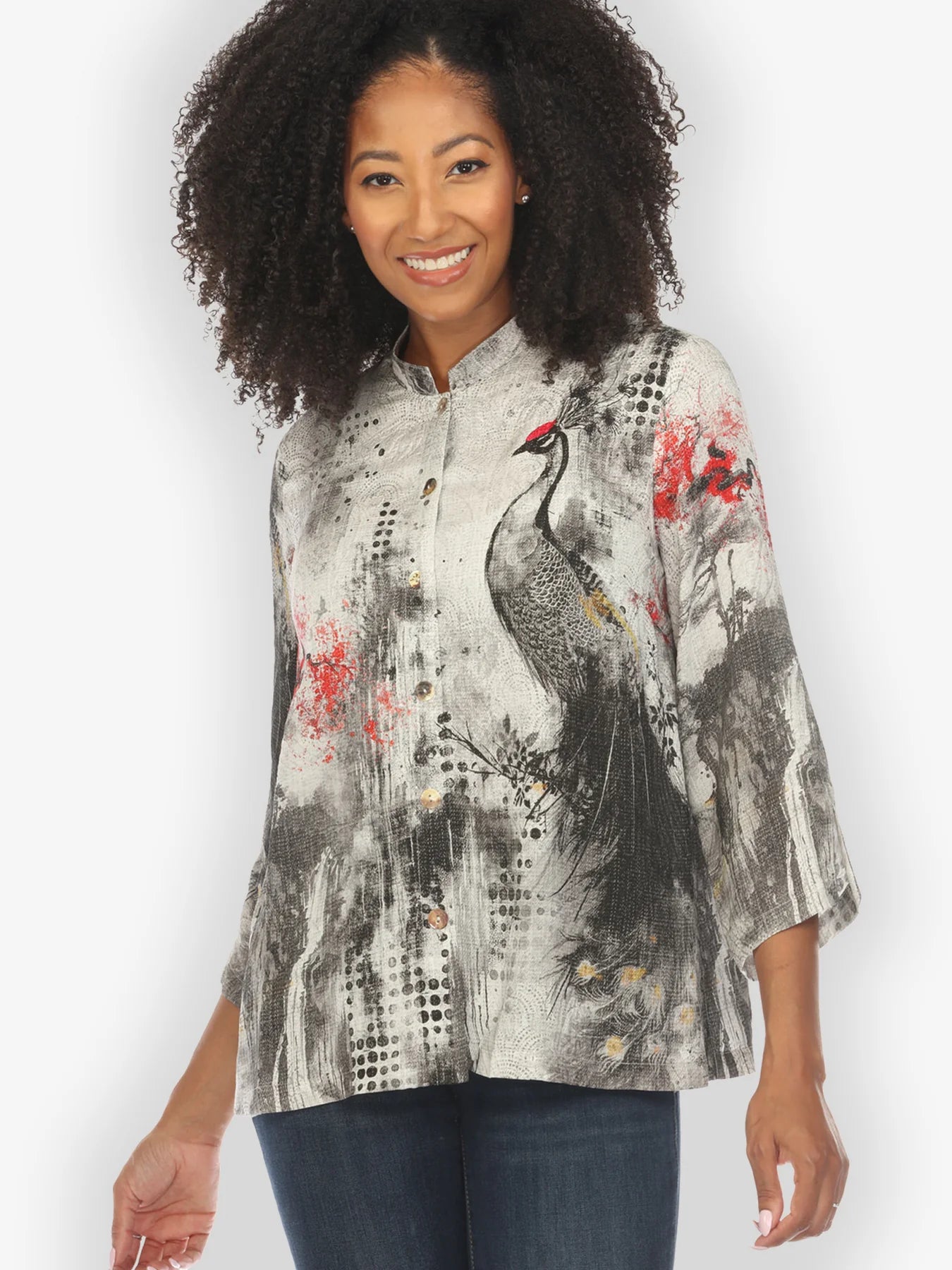 Classic Citron style blouse is styled in our signature textured Silk Blend fabrication. This versatile black-and-white print with a beautiful monochromatic peacock asymmetrically placed is accented by a red flower. The blouse has 3/4 sleeves with slits and a mandarin collar. Hand Wash / Dry Flat.