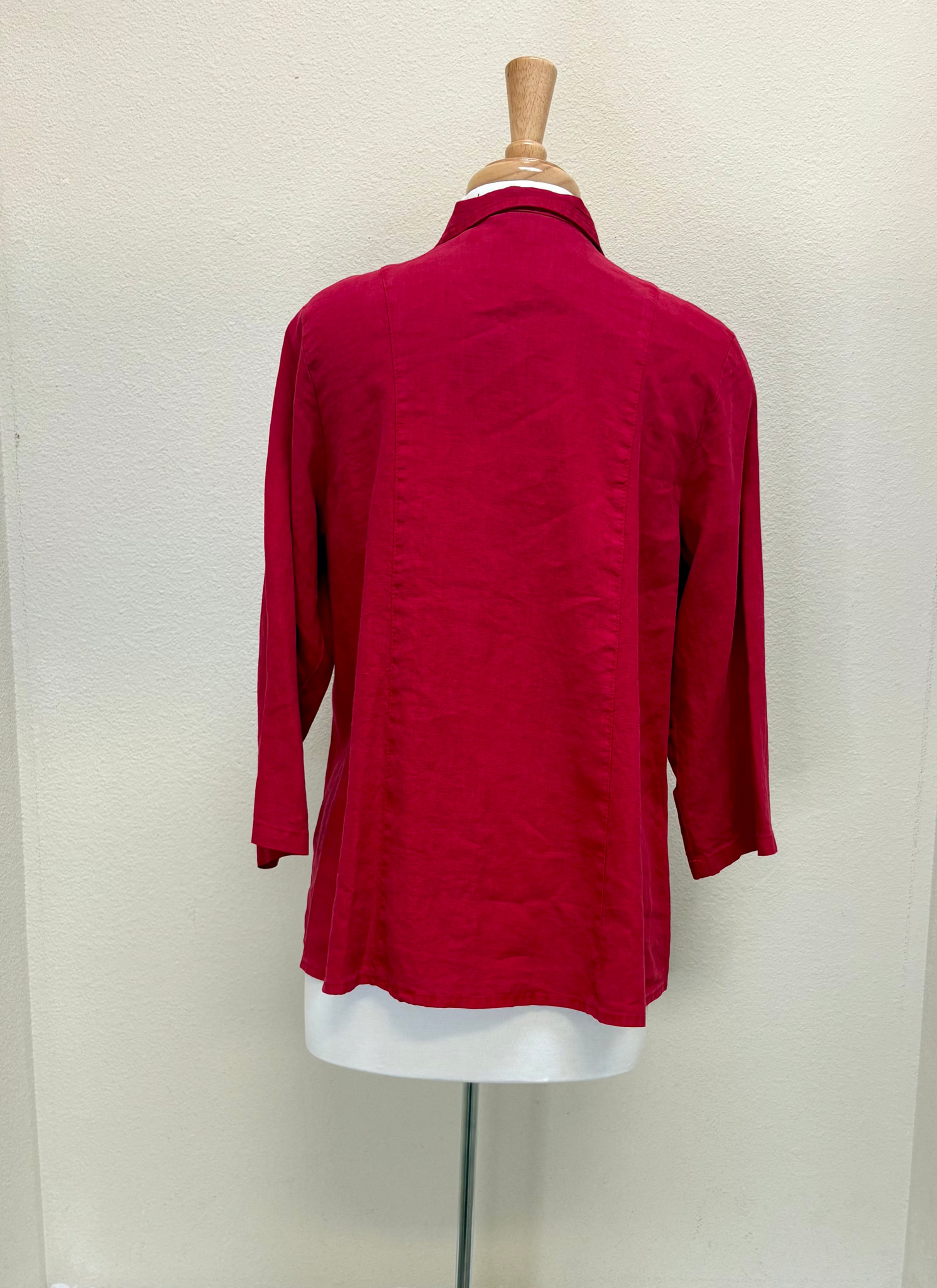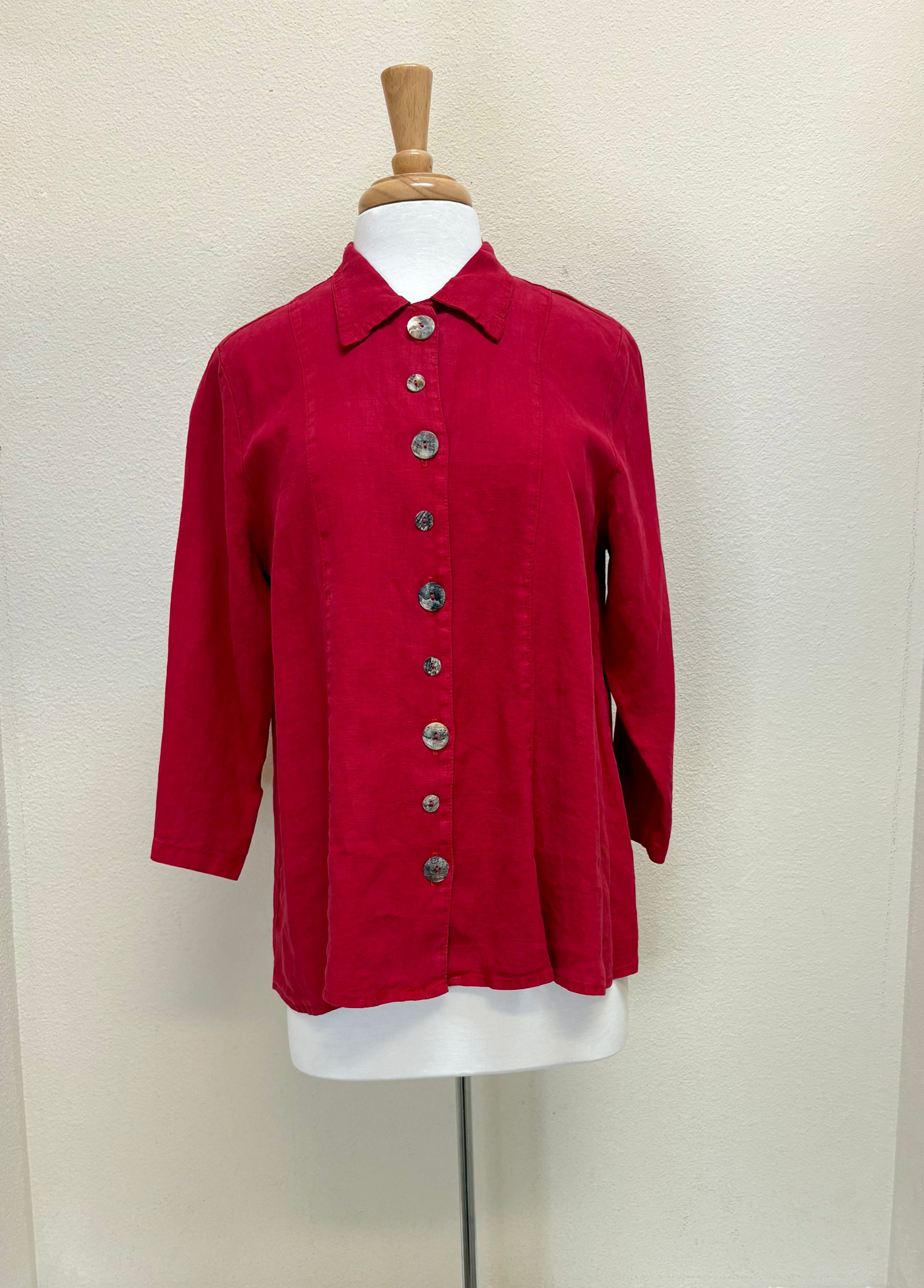 The Color Me Cotton CMC Top is an elegant addition to any wardrobe. Its clean, classic design is enhanced by the striking Valentine red hue, offering versatility when styled with different pants or skirts. Distinctively, this shirt is embellished with unique seashell buttons, adding a subtle yet refined detail to its overall aesthetic.