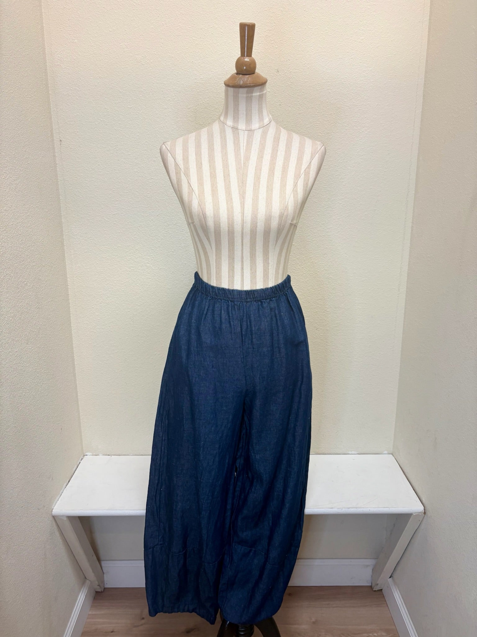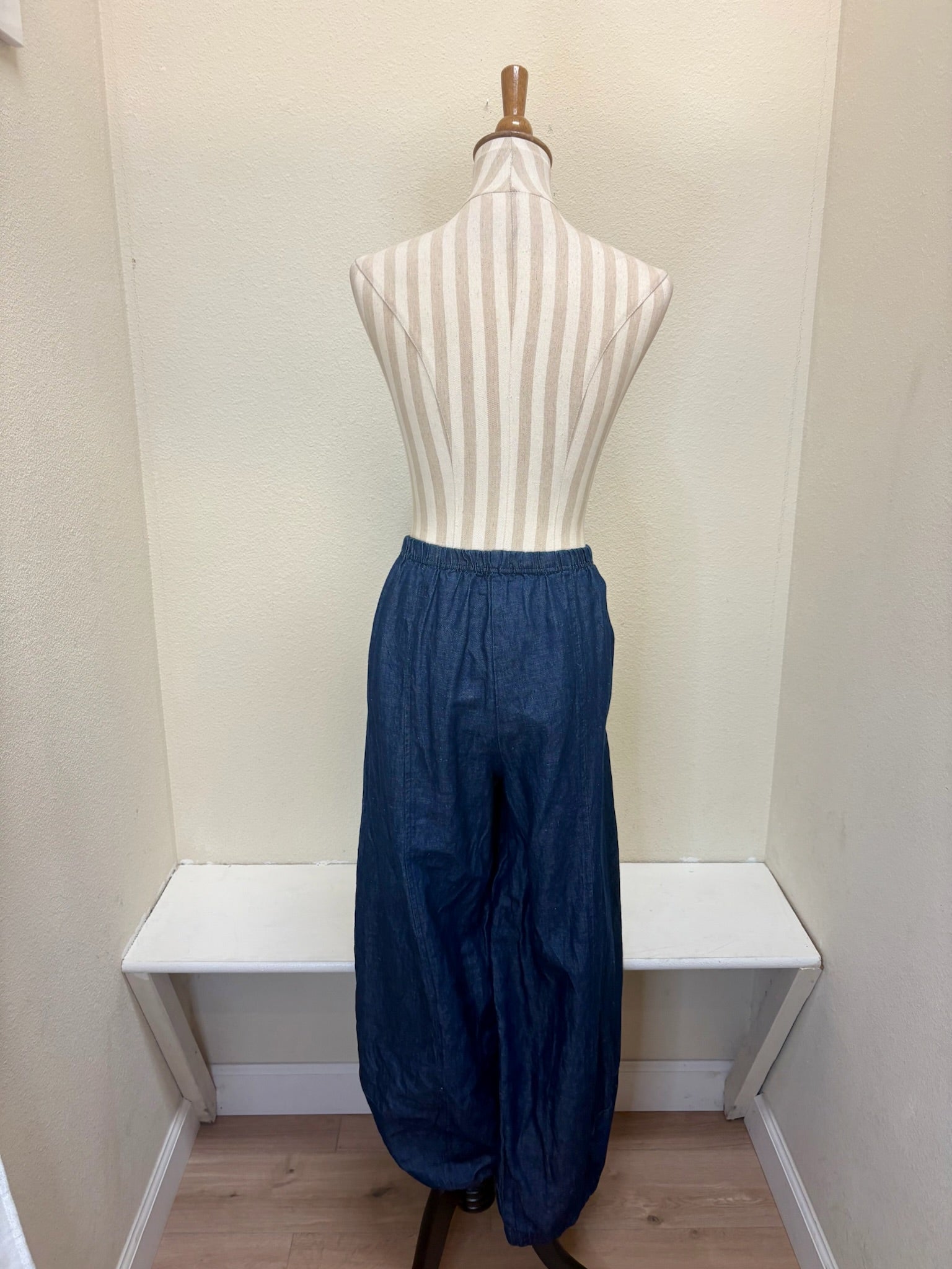 Cut Loose - your "go-to" pieces! A wonderful fabric and design! This flax denim lantern pant features an elastic waist and a lantern leg. Made from flax cotton, it is breathable and comfortable. A wonderful wardrobe addition! Only available in laundered - color shown.