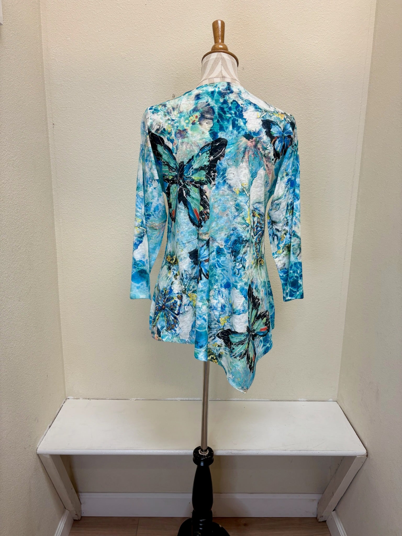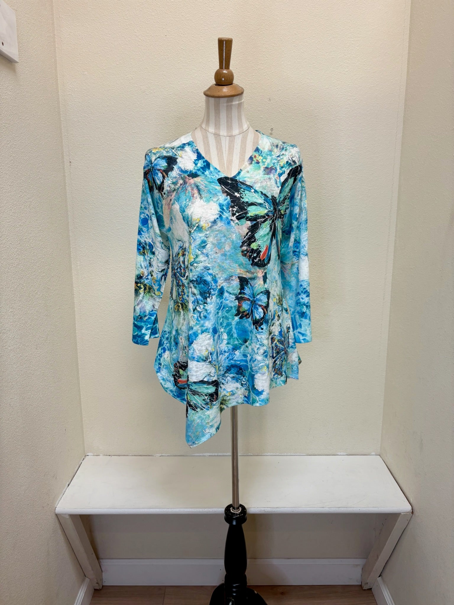 This artsy teal butterfly print is the perfect pattern to dress up or down for endless outfit possibilities. Featured in the Et Lois Moon body, this top creates a flattering and comfortable fit with a 3/4 sleeve length, v-neck style and asymmetrical hemline. Don’t miss out on this incredible addition to your wardrobe!