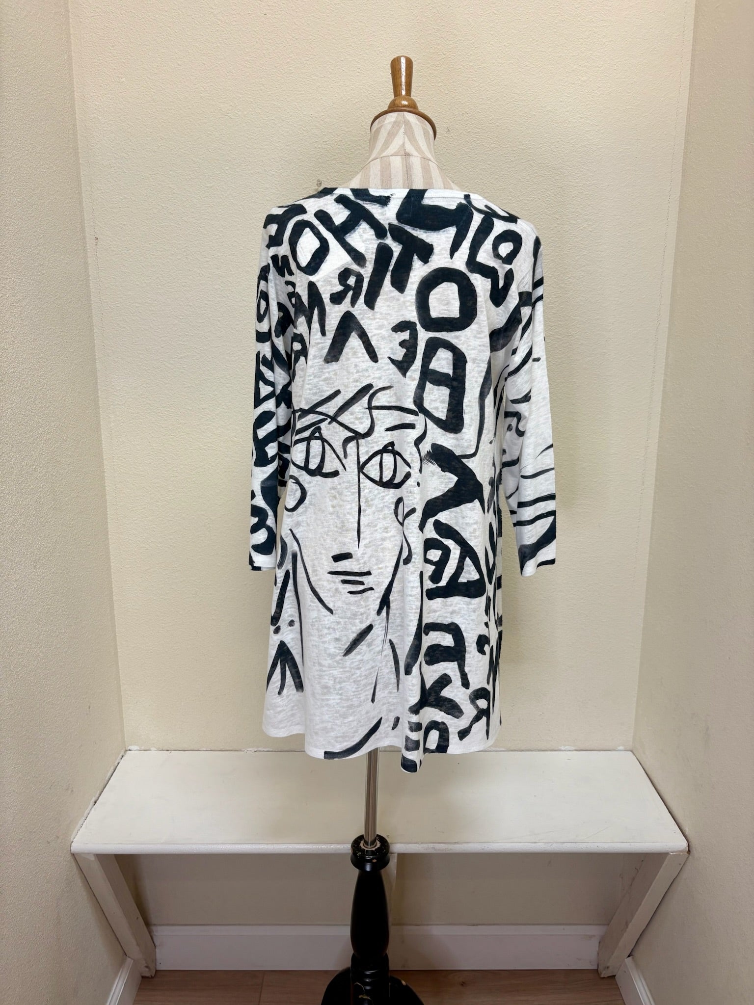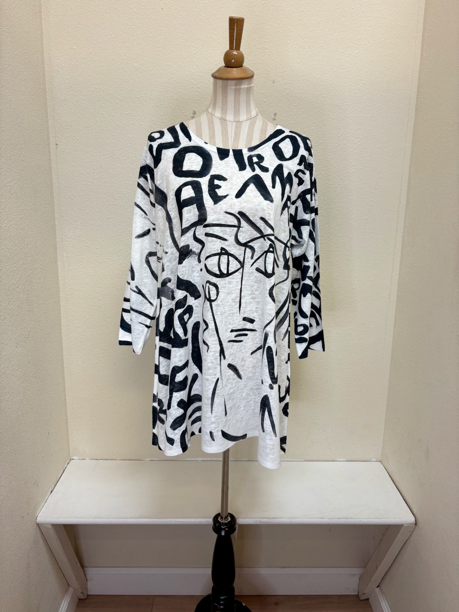 This black & white graphic print is the perfect pattern to dress up or down for endless outfit possibilities. Featured in the Et Lois Lowa body, this top creates a flattering and comfortable fit with a 3/4 sleeve length, a classic scoop neck, and A-line swing style. Don’t miss out on this incredible addition to your wardrobe!