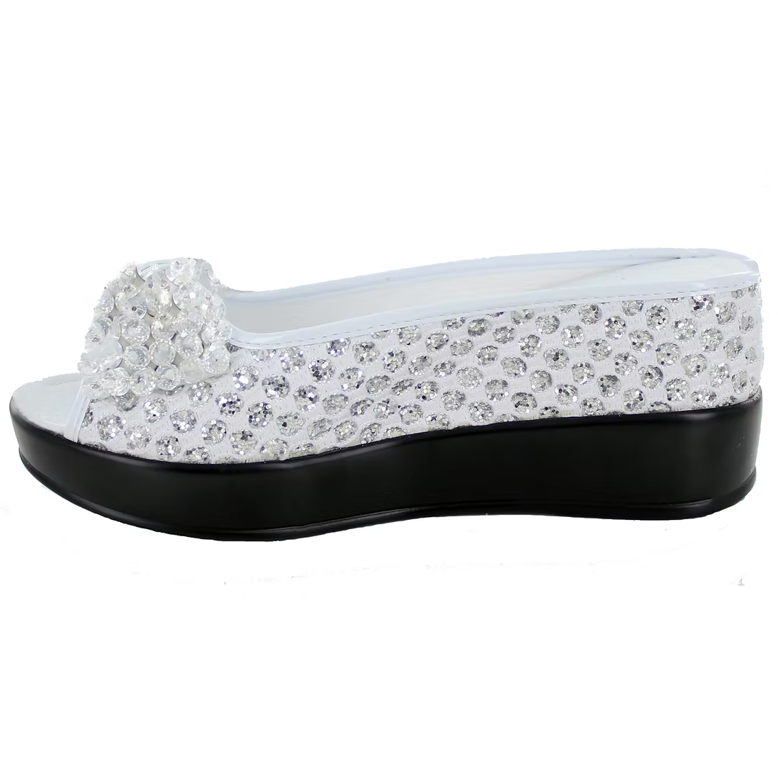 Open toe ladies wedge sandal with sparkle fabric sides and crystal bow.(Heel:3 inch)