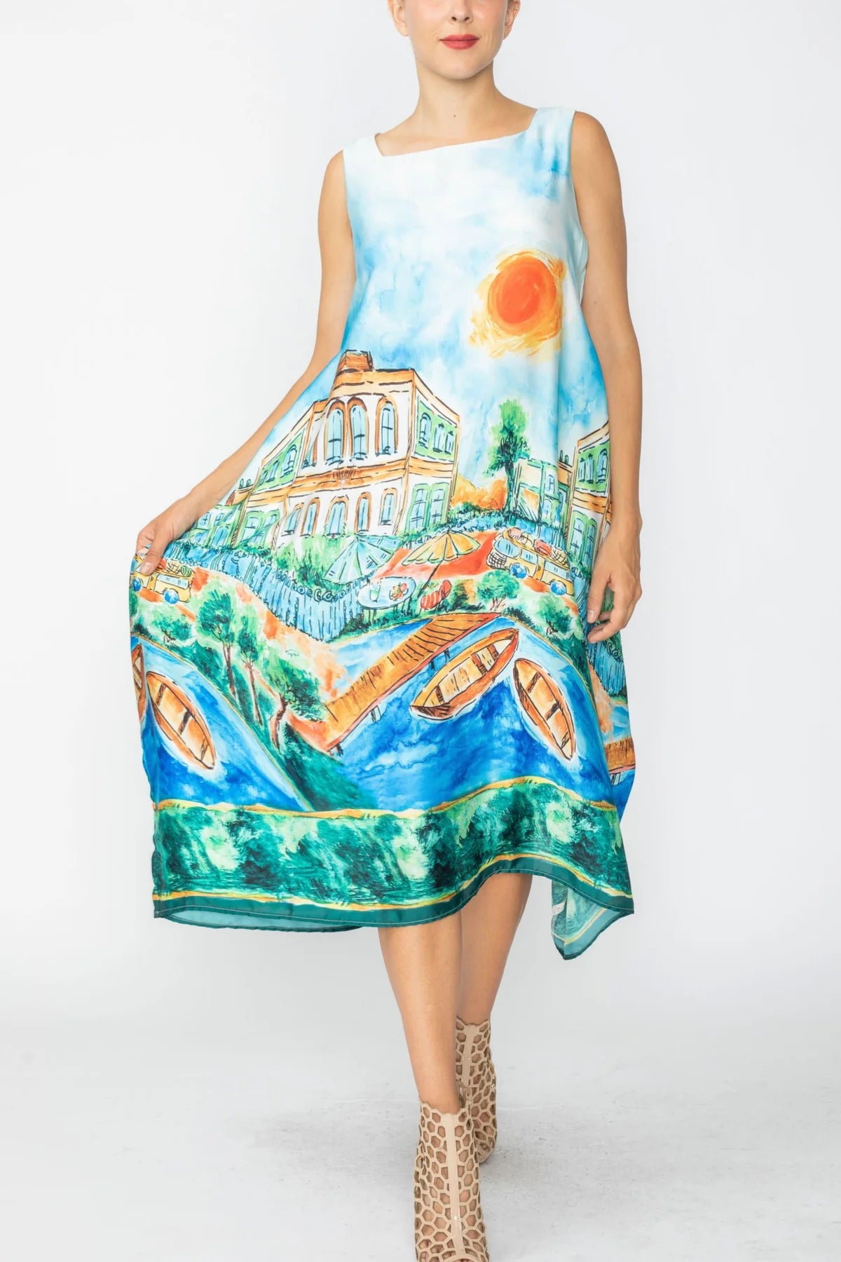 SQUARE NECK SLEEVELESS PRINT DRESS