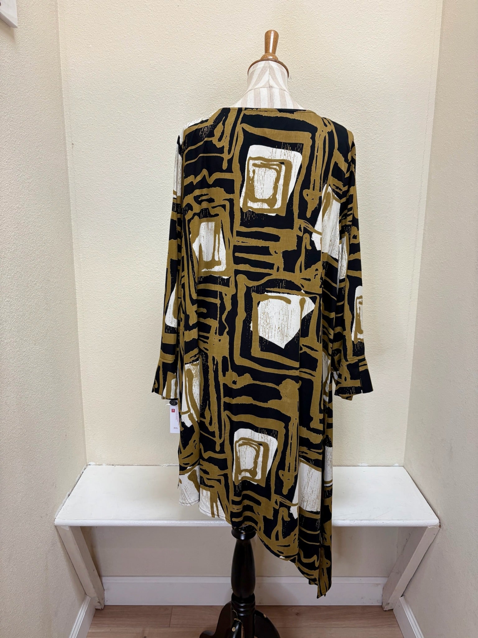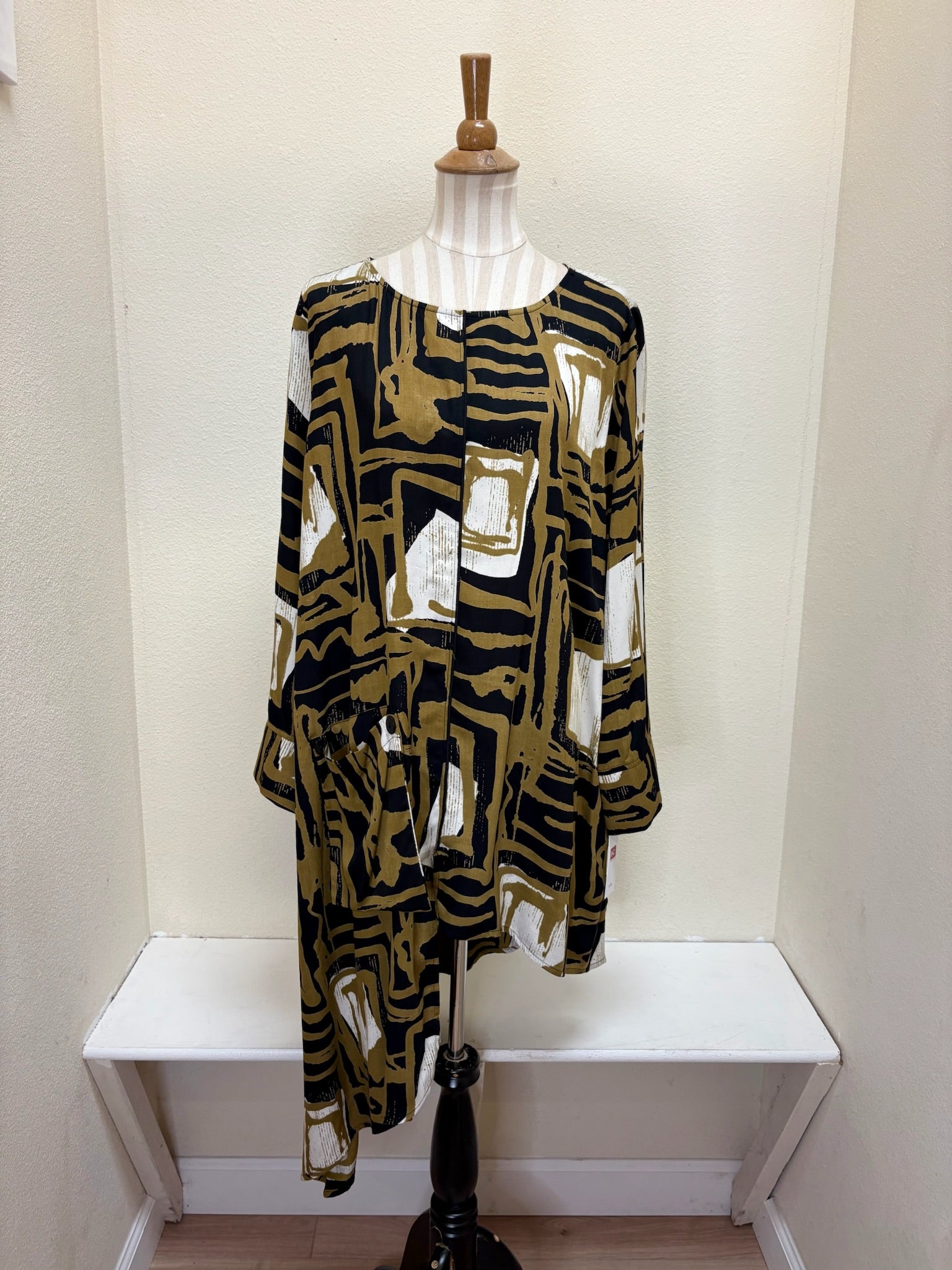 Elevated tunic silhouette featuring a high-low hemline that combines contemporary style with timeless sophistication. This versatile piece transitions effortlessly from casual to refined occasions, offering a flattering cut that works beautifully with your existing wardrobe. The olive tone adds depth and understated elegance to any ensemble.