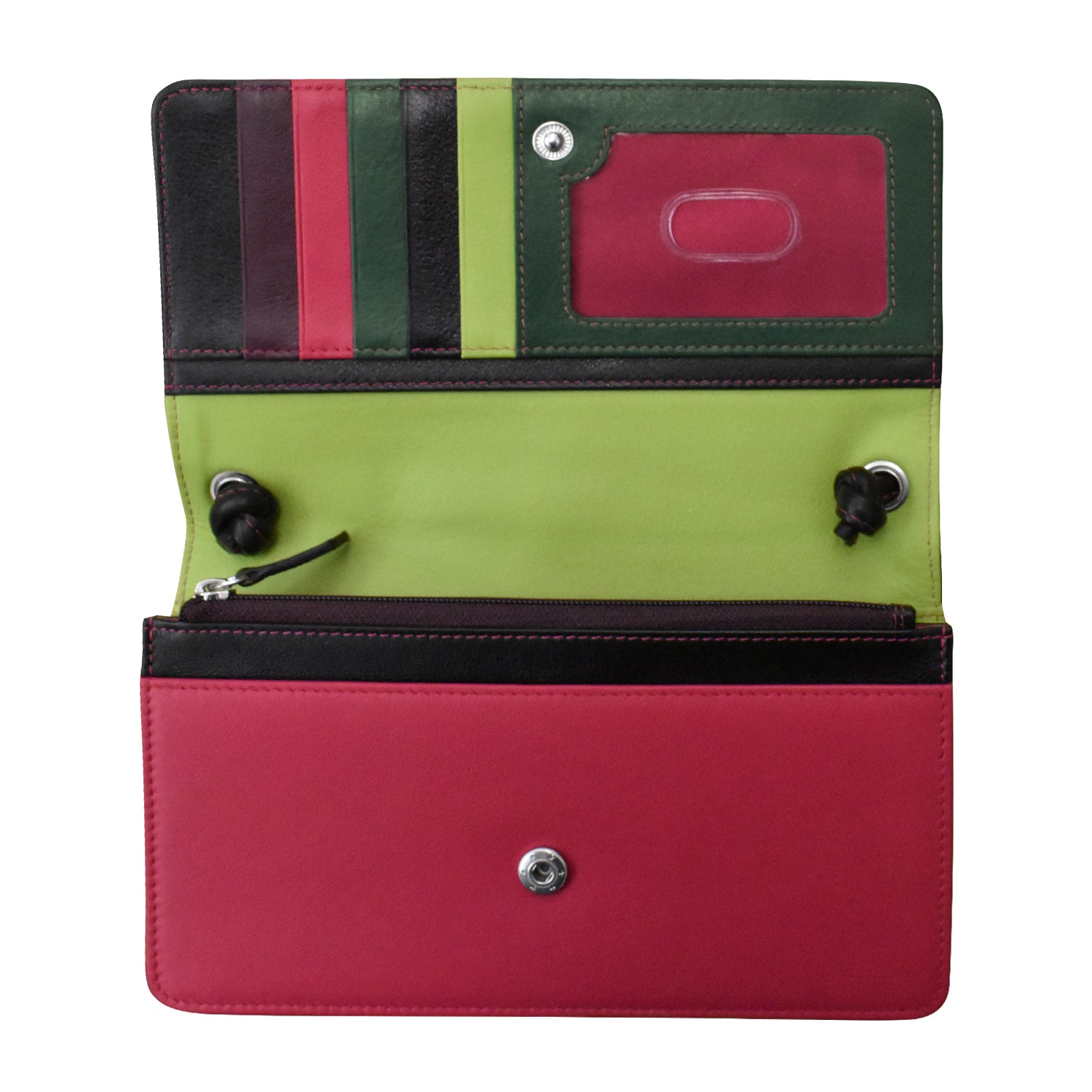 Five credit card slots, I.D. window, three slip pockets and zip pocket under flap.