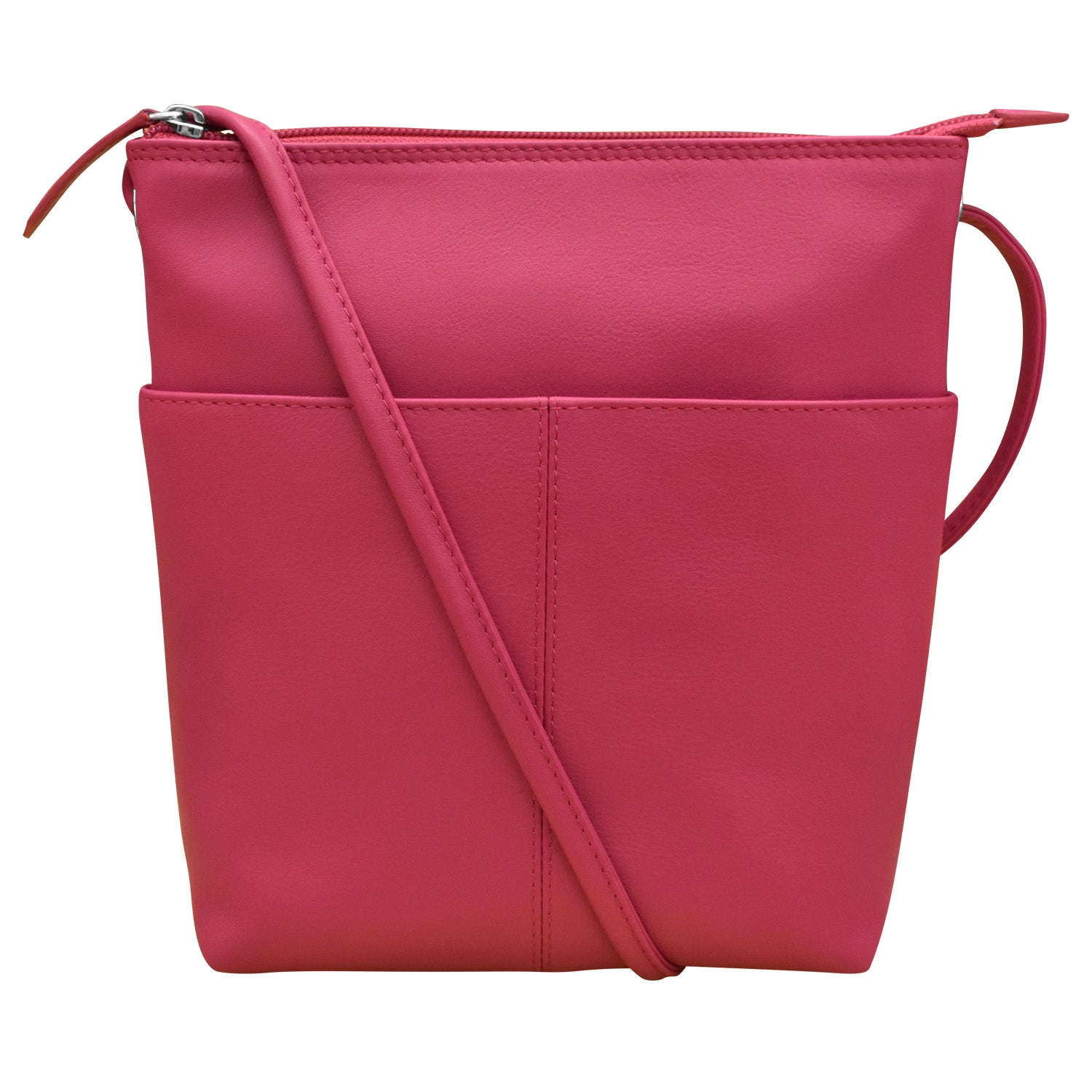 Front slip pocket and back zip pocket. Inside zip pocket.