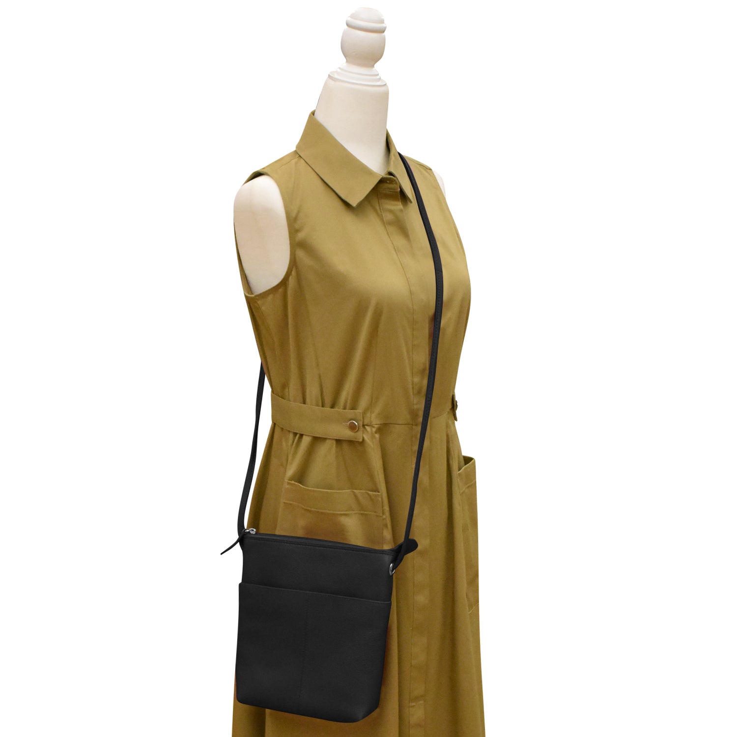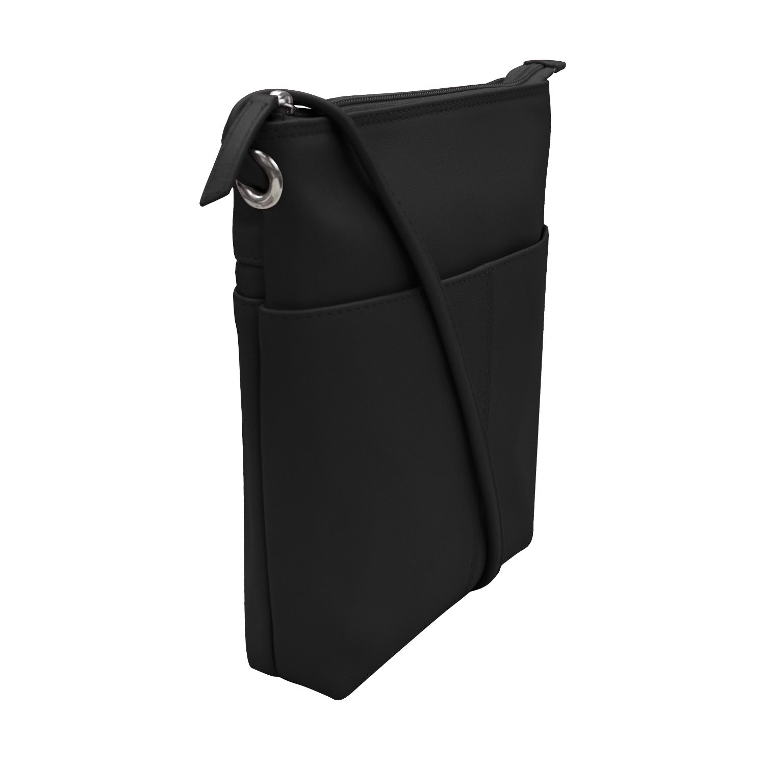 Front slip pocket and back zip pocket. Inside zip pocket.