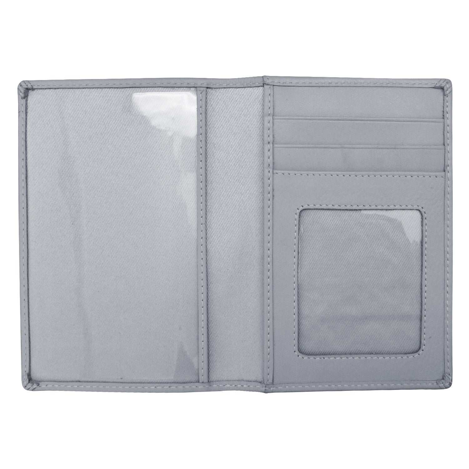 Back slip pocket. Clear passport window, I.D. window, three credit card slots and slip pocket.