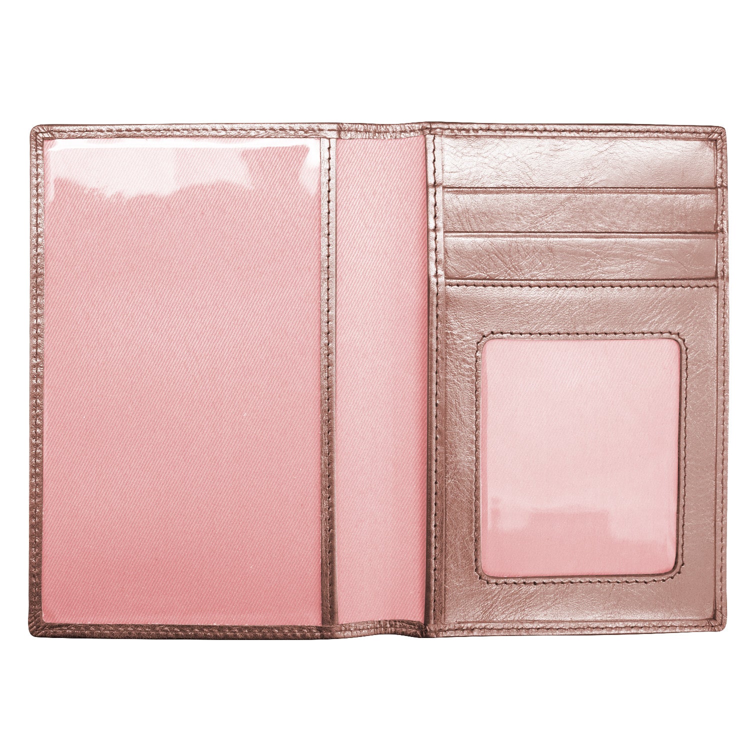 Back slip pocket. Clear passport window, I.D. window, three credit card slots and slip pocket.